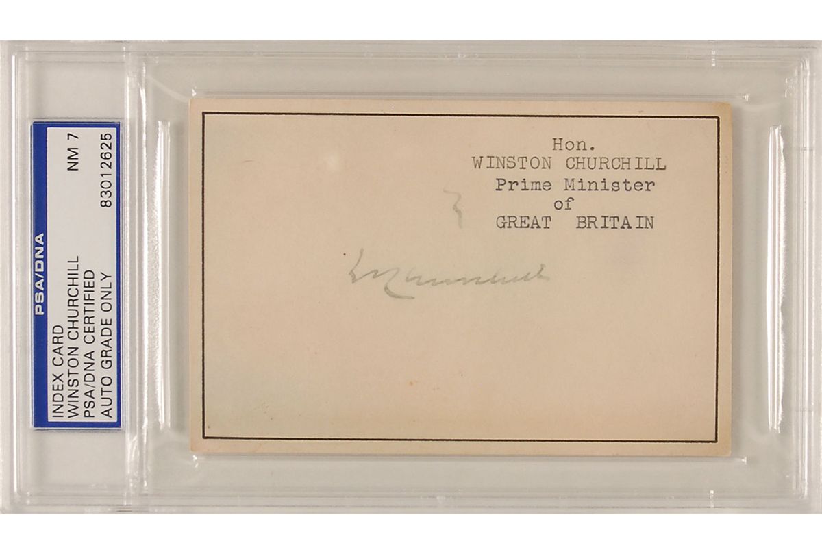 Fountain pen signature, “W. Churchill,” on an off-white 4.75 x 3 card bearing a typed notation. Encapsulated in a plastic PSA/DNA authentication holder and given an autograph grade of 7. In fine condition, with light overall toning and the signature a shade light.