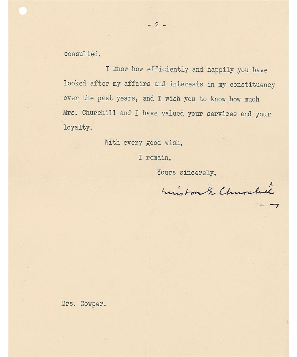 TLS signed “Winston S. Churchill,” two pages, 7.5 x 9.5, Prime Minister letterhead, November 27, 1951. Letter to Mrs. Cowper. In part: “I have been preoccupied with national problems since becoming Prime Minister so that it is only just recently that I have been able to consider my personal affairs, and how they affect all the people who have been working for me over the past years…I am afraid, that we shall all have to face certain changes. I have decided that I would like Miss Marston to remain at No. 27 and deal with certain matters on my behalf. I propose that she shall take over the responsibilities which you have undertaken so well for me in connection with my constituency…I know how efficiently and happily you have looked after my affairs and interests in my constituency over the past years, and I wish you to know how much Mrs. Churchill and I have valued your services and your loyalty.” In fine condition, with central horizontal and vertical folds and a punch hole to top left corner of both pages.