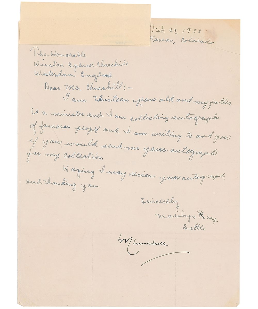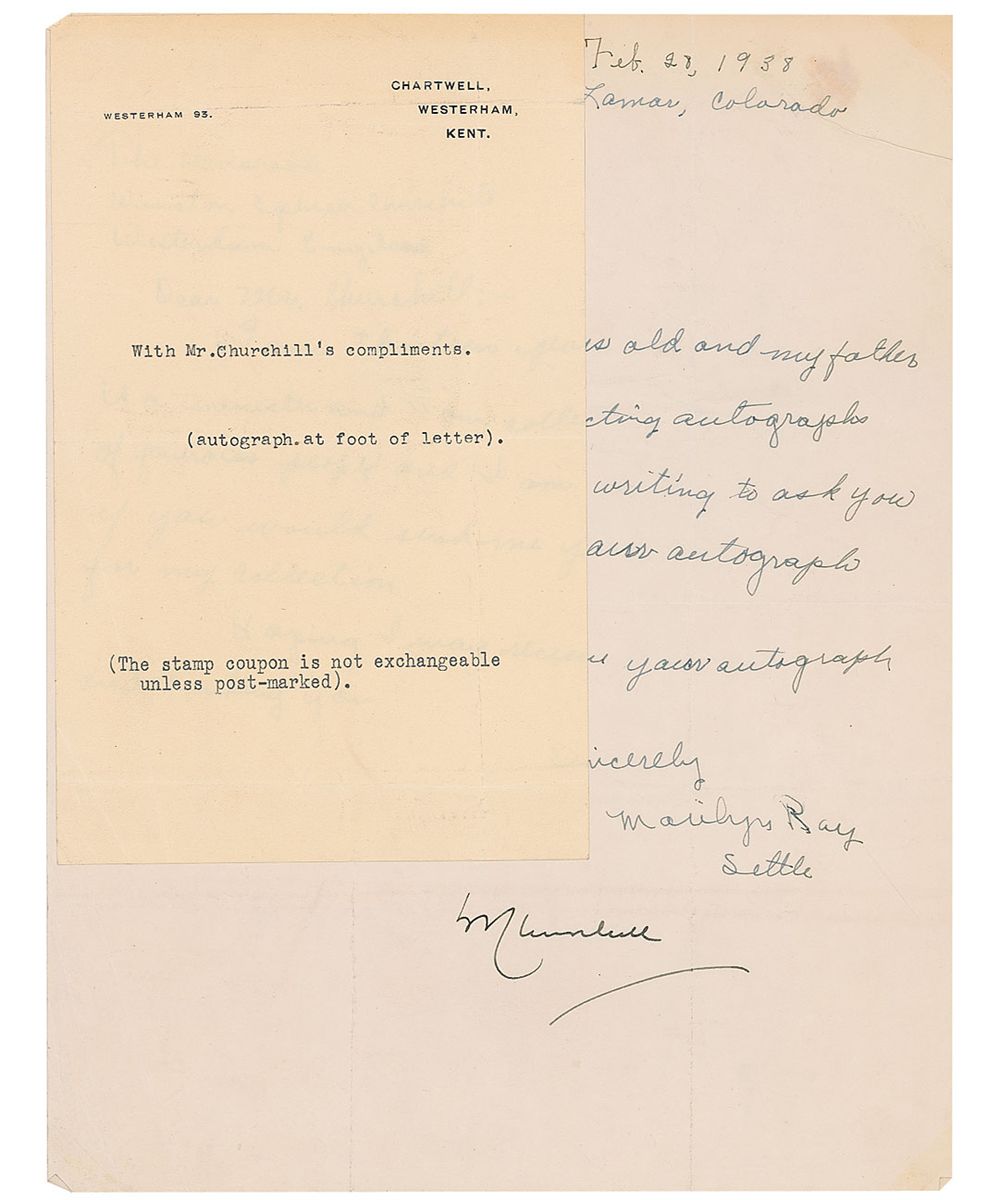 Vintage fountain pen signature, “W. Churchill,” at the bottom of an admirer’s autograph request, one page, 8.5 x 11, February 28, 1958. A transmittal slip on Chartwell letterhead is affixed to the top. In fine condition, with intersecting folds.