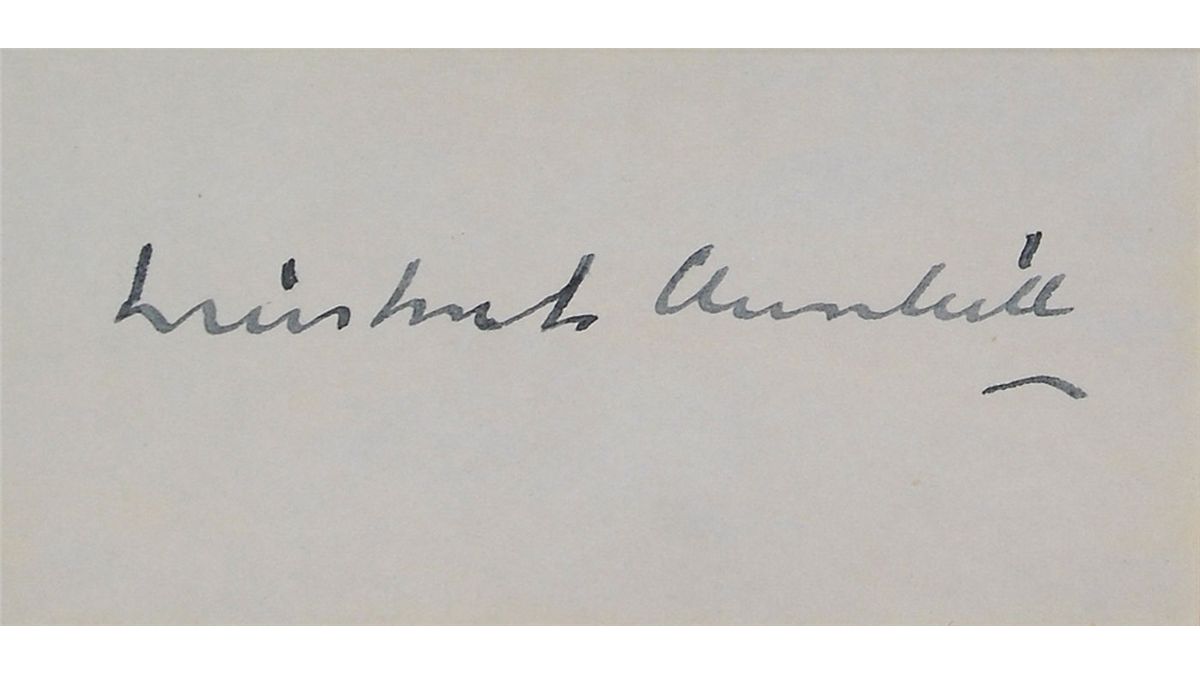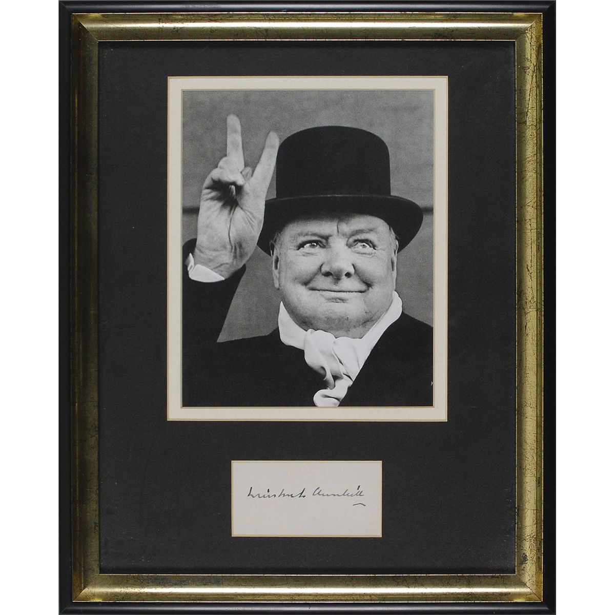 Outstanding fountain pen signature, “Winston S. Churchill,” on an off-white sheet. Double-matted and framed with a portrait of Churchill giving the ‘V for victory’ sign to an overall size of 12.5 x 15.5. In very fine condition.