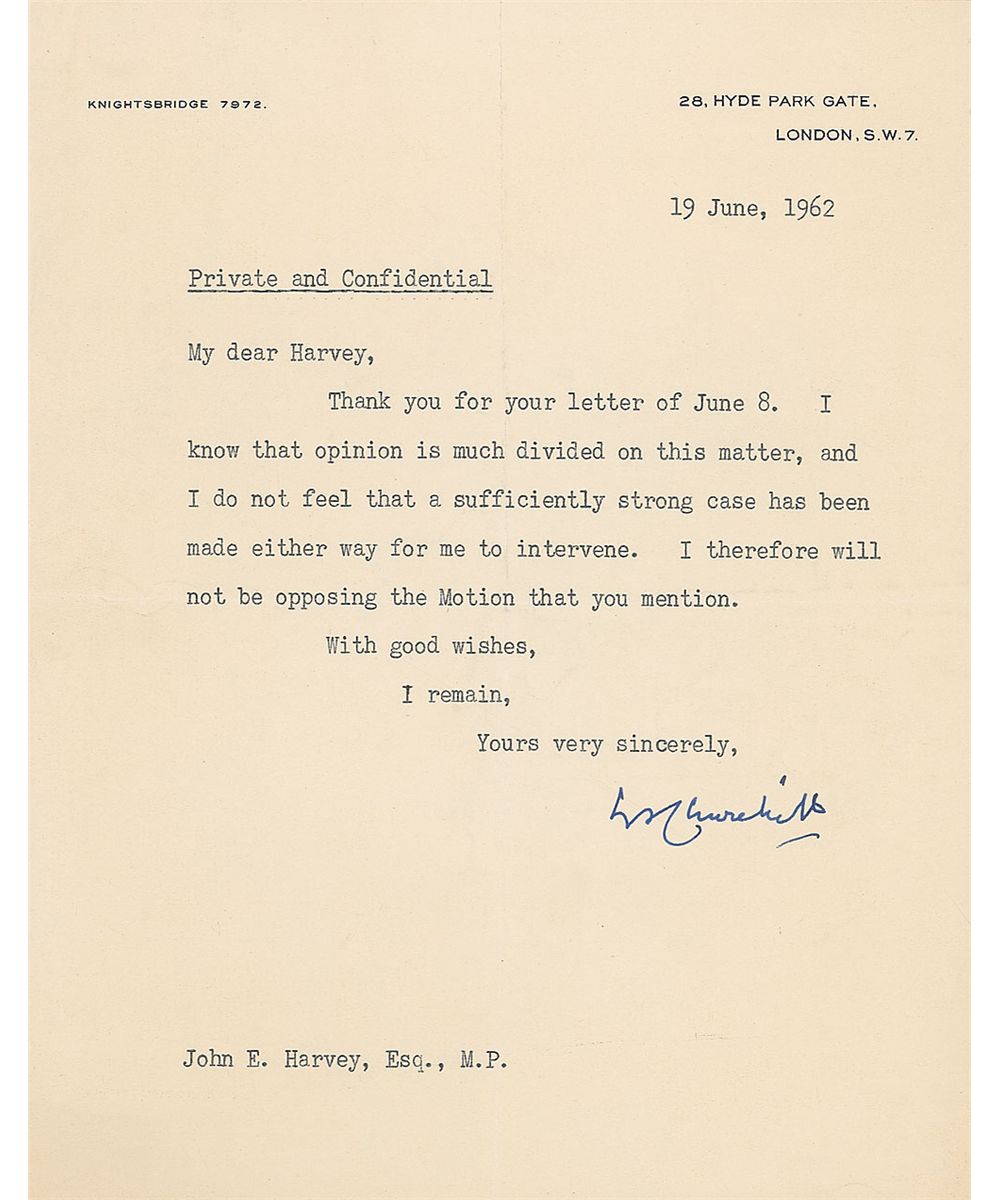 TLS signed “W. Churchill,” one page, 7.5 x 9.5, personal letterhead, June 19, 1962. Letter to John E. Harvey. In full: “Thank you for your letter of June 8. I know that opinion is much divided on this matter, and I do not feel that a sufficiently strong case has been made either way for me to intervene. I therefore will not be opposing the Motion that you mention.” In fine condition, with central vertical and horizontal folds.