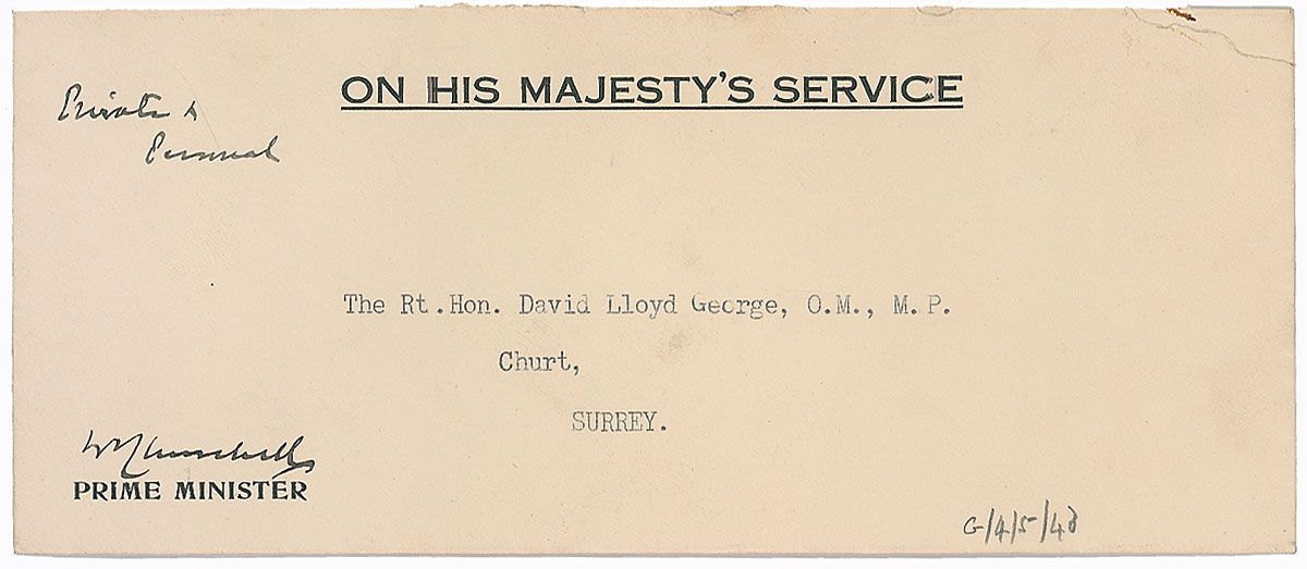 Prime Minister mailing envelope, 8.75 x 3.75, addressed in type to David Lloyd George, signed along the left side, “Private & personal, W. S. Churchill.” Bottom of the envelope is notated “G/4/5/48,” in another hand. The reverse of the envelope retains the complete red wax Treasury seal. In fine condition.