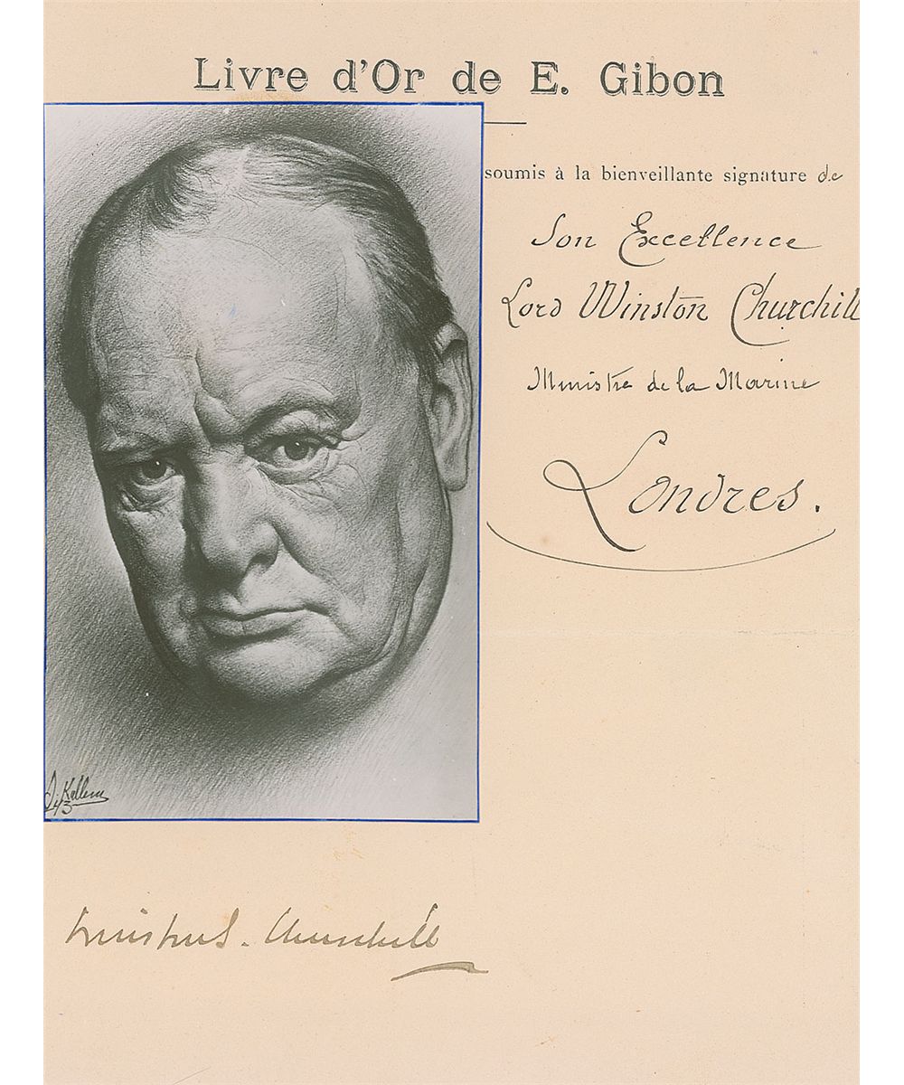 Vintage fountain pen signature, “Winston S. Churchill,” on an off-white 6.25 x 8.25 custom-made album page, headed at the top, “Livre d’Or de E. Gibon,” with several collector’s notations at the top. In fine condition, with a horizontal fold near center, a staple hole through photo, and mounting remnants to reverse. A very presentable signature suitable for matting.