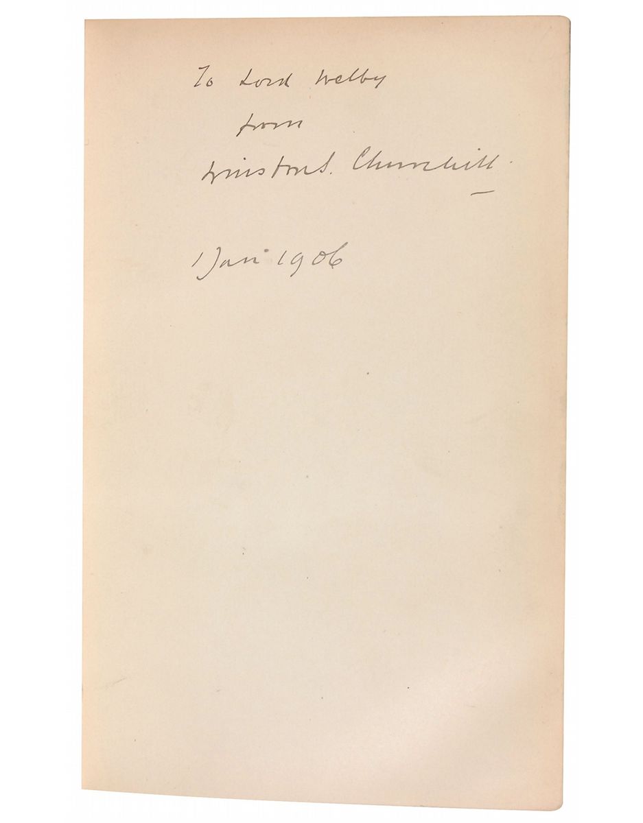 Signed book: Life of Lord R. Churchill, Volumes I and II. First edition. London: Macmillan and Co. Limited, 1906. Hardcover, 5.75 x 8.75, 564 and 531 pages. Signed and inscribed on the third free end page of Volume I, “To Lord Welby from Winston S. Churchill, 1 Jan 1906.” Autographic condition: fine, with some mild edge toning to signed page. Book condition: VG-/None. Reginald Earle Welby (1832-1915) served as permanent secretary to the treasury from 1885–1894. Following his retirement he was raised to the peerage as Baron Welby of Allington in the County of Lincoln. In Volume II of this biography, Churchill quotes at length of Welby’s impression of his father when he became Chancellor of the Exchequer in 1886.