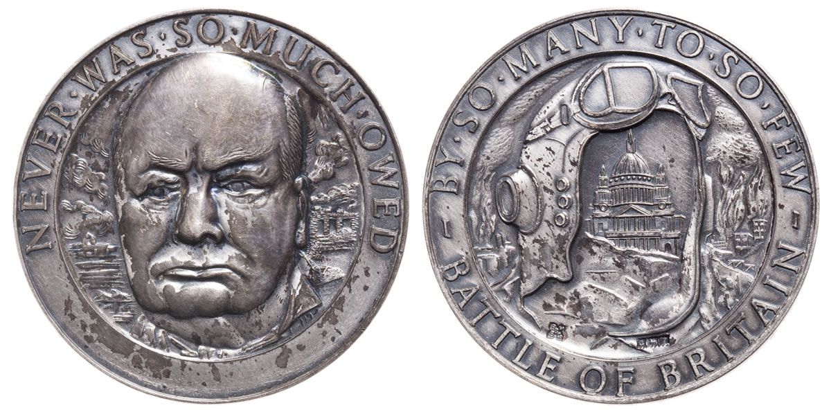 Battle of Britain Medla, Obv: "Never Was So Much Owed", bust facing; Rev: "By So Many To So Few/Battle of Britain", flying helmet at centre, surrounded by flames, building at centre in helmet; Ar, Sterling, 74.2 gms, 51mm. EF+, toned. ASW 2.2069 oz.