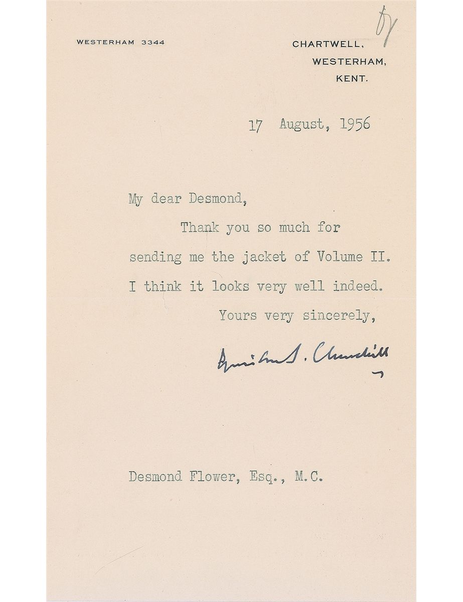 TLS signed “Winston S. Churchill,” one page, 5 x 8, Chartwell letterhead, August 17, 1956. Letter to Desmond Flower. In full: “Thank you so much for sending me the jacket of Volume II. I think it looks very well indeed.” In fine condition. Flower was a publisher, book collector, and scholar who headed the Cassell & Co. publishing house, through whom Churchill published most of his writing, including the four-volume A History of the English-Speaking Peoples in 1956—most likely the work to which he is referring in this letter.