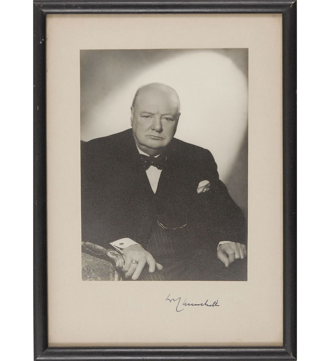 Exquisite matte-finish 4.25 x 6 portrait of Churchill in a distinguished pose, affixed to a 6 x 8.75 mount, nicely signed on the mount in fountain pen, “W. Churchill.” Also signed in the lower left of the image in pencil by the photographer, “Vivienne, London.” Framed to an overall size of 6.75 x 9.25. In fine condition, with a trivial spot of dampstaining to the bottom edge.