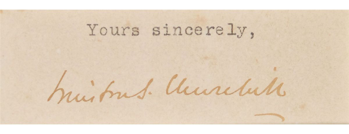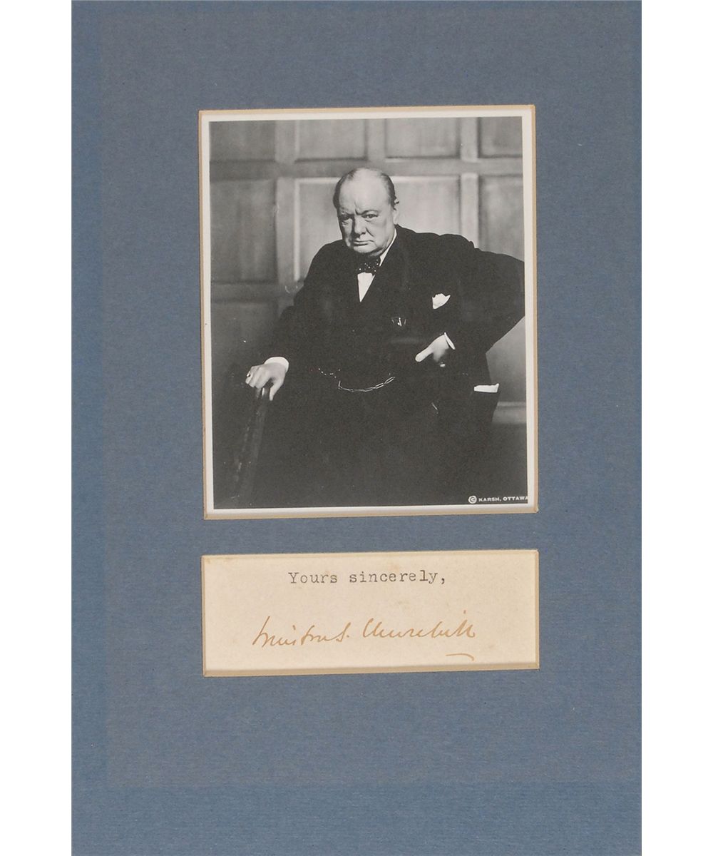 Ink signature, “Winston S. Churchill,” on an off-white slip clipped from the closing of a letter. Matted with a portrait of Churchill to an overall size of 5.75 x 8.75. Light overall toning, otherwise fine condition. Item is housed in a custom clamshell case.