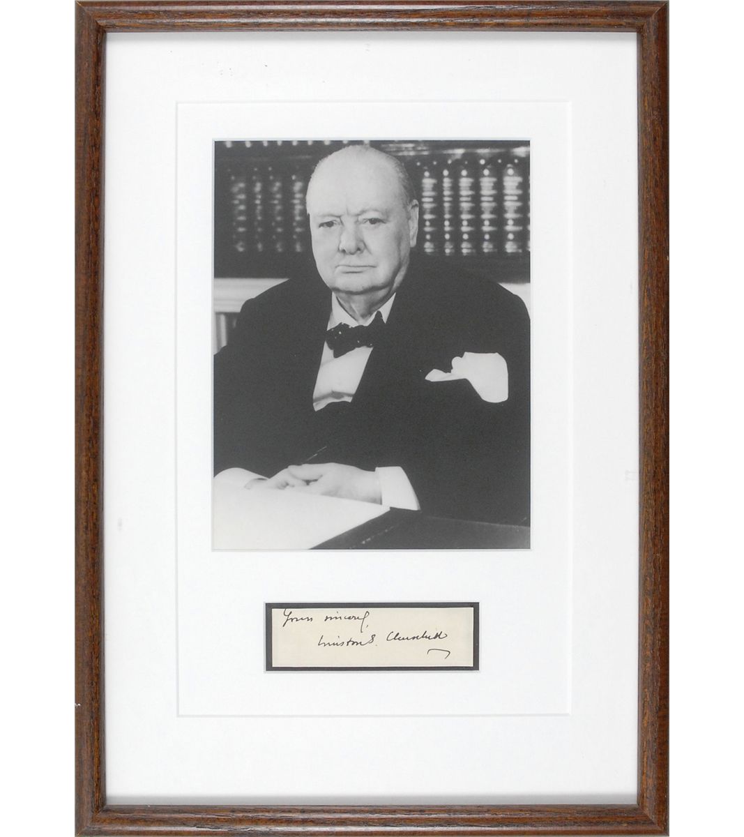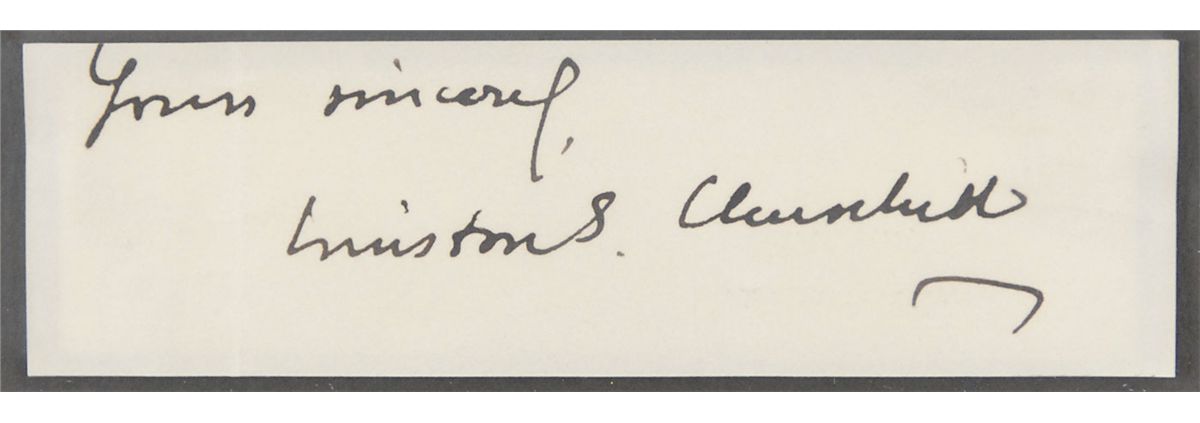 Bold ink signature, “Yours sincerely, Winston Churchill,” on an off-white 4.5 x 1.25 slip. Handsomely matted and framed with a portrait of Churchill to an overall size of 13.5 x 19. In fine condition.