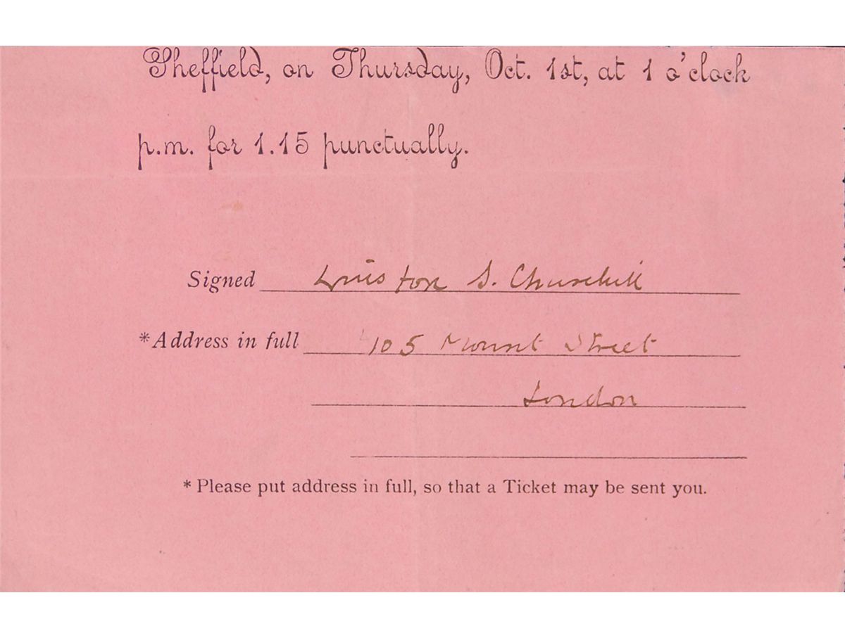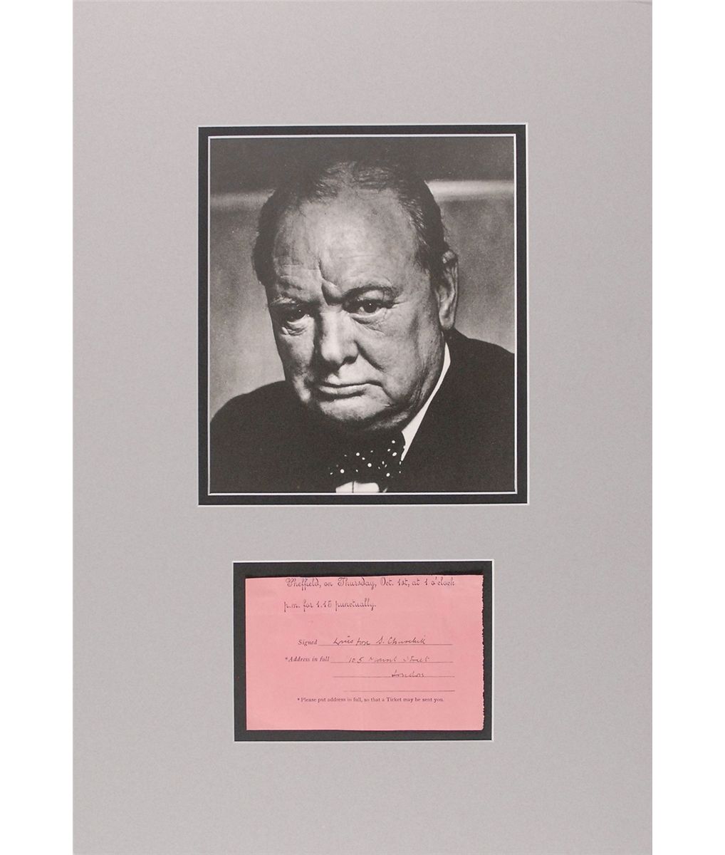 Partial DS, one page, 5 x 3.25, no date but circa September 1903. The concluding portion of a form for an event at “Sheffield, on Thursday, Oct. 1st, at 1 o’clock,” filled out and signed by Churchill to request that a ticket be sent to him, “Winston S. Churchill, 105 Mount Street, London.” Double-matted with a portrait of Churchill to an overall size of 12.75 x 18.5. Intersecting folds (one vertical fold passing through a single letter of the signature) and a trimmed top edge, otherwise fine condition. Though undated, this is almost certainly for an event on October 1, 1903, as Churchill only lived at this Mount Street address from 1900 to 1905, and 1903 was the only year during this period that October 1 fell on a Thursday; this date also coincides with the Conservative National Union Conference at Sheffield, which Churchill attended.