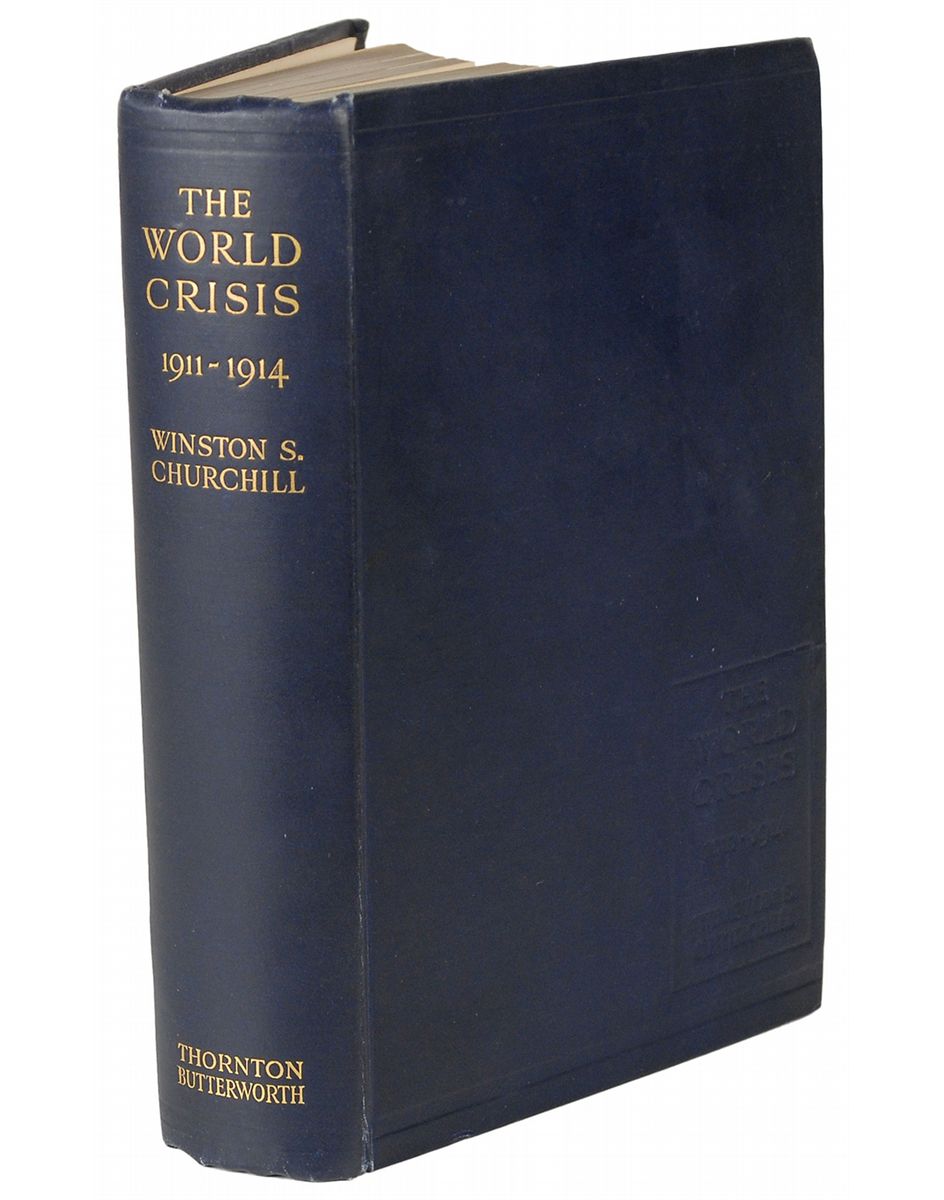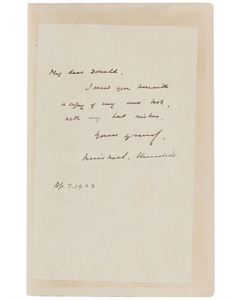 ALS signed “Winston S. Churchill,” one page, 5 x 8, blindstamped Villa Reve letterhead, April 7, 1923. Letter to newspaper editor Robert Donald. In full: “I send you herewith a copy of my new book, with my best wishes.” The letter is affixed to the first free end page of the mentioned book: The World Crisis. First edition, first printing. London: Thornton Butterworth Limited, 1923. Hardcover, 6.75 x 9.5, 536 pages. Letter in fine condition, with intersecting folds, and mild rippling and toning from adhesive. Book condition: VG-/None. Churchill stayed at Villa Reve d’Or near Cannes, France, from November 1922 to May 1923, where he finished writing the book, which was released on April 10, 1923, three days after he sent this copy to Donald. Having been editor of the Daily Chronicle from 1904 to 1918, Donald established a close relationship with multiple prime ministers, also including David Lloyd George, who in 1917 commissioned him to produce a report on government propaganda.