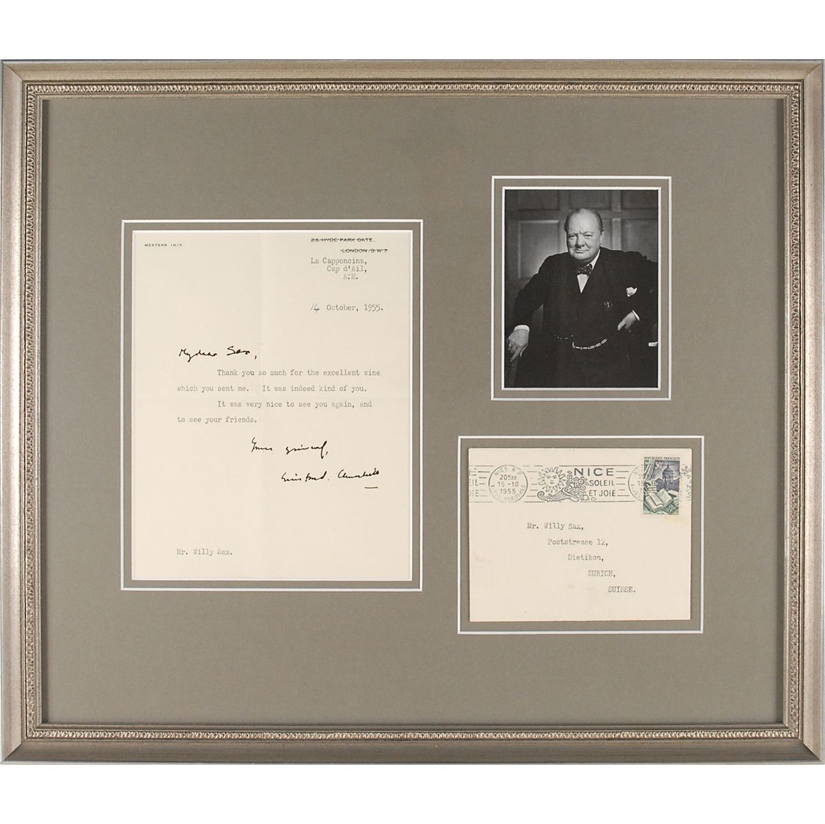 TLS signed “Yours sincerely, Winston S. Churchill,” one page, 6.75 x 8.5, personal Hyde Park Gate letterhead [struck through and replaced with a typed French address], October 14, 1955. Letter to Swiss paint manufacturer Willy Sax. In full: “Thank you so much for the excellent wine which you sent me. It was indeed kind of you. It was very nice to see you again, and to see your friends.” At the top, Churchill also penned, “My dear Sax.” Attractively double-matted and framed with the original mailing envelope and a small portrait to an overall size of 20 x 17. In fine condition, with central vertical and horizontal folds. Churchill, an avid painter himself, seems to have been introduced to Sax in the 1940s and wrote to him until Sax passed in 1964. In their correspondence, Churchill ordered paints, asked for advice about technical aspects of paints and painting, and exchanged cordial pleasantries. A fine association with the important politician’s famous hobby.