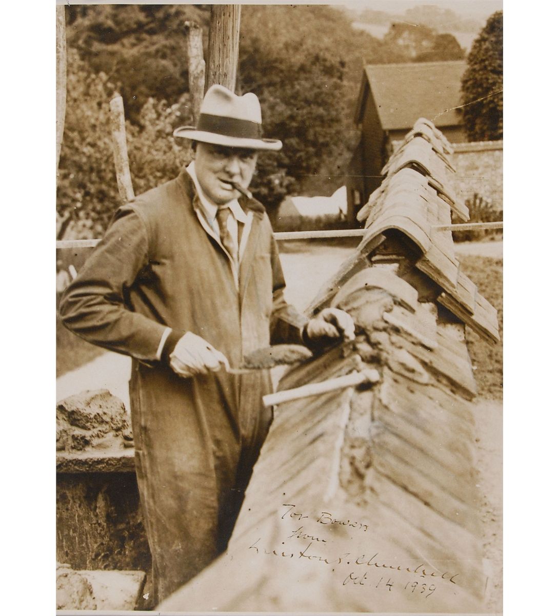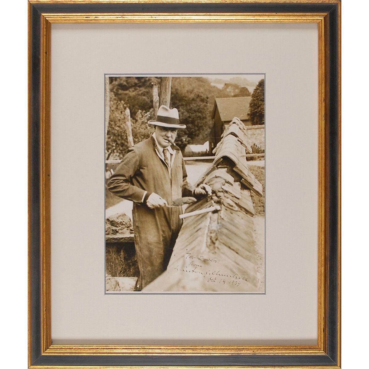 Remarkable matte-finish 6.75 x 9.25 photo of Churchill, cigar clenched between his teeth, doing some outdoor masonry work, signed and inscribed in fountain pen, “For Bowen, from Winston S. Churchill, Oct. 14, 1939.” Matted and framed to an overall size of 13.5 x 16. In fine condition. One of Churchill’s most unusual interests and hobbies was bricklaying, which he became quite skilled at, even becoming a qualified member of the Amalgamated Union of Bricklayers. He found the practice relaxing and built a number of things around his Chartwell home, including a brick wall around his vegetable garden and a goldfish pond. A simply fantastic portrait of Churchill showing a generally unknown side of his personality.