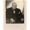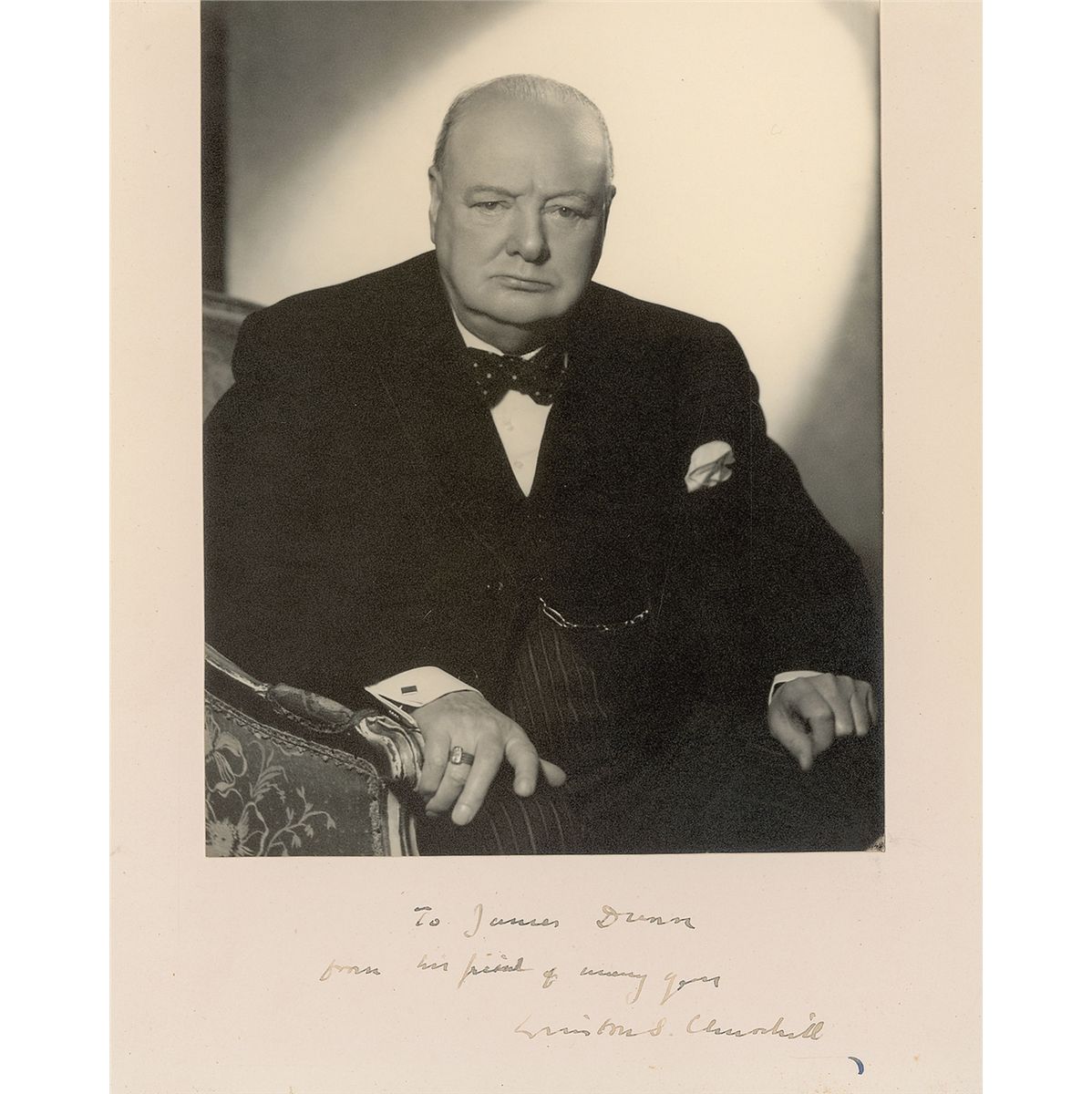 Iconic matte-finish 6 x 7.75 formal portrait of Churchill by Vivienne, affixed to an 8 x 10 mount, signed and inscribed on the mount in fountain pen, “To James Dunn from his friend of many years, Winston S. Churchill.” Reverse bears the photographer’s stamp and a clipped section of 10 Downing Street letterhead, dated in type March 25, 1954. Trimmed top edge to photo and mount, and signature and inscription just a shade light, otherwise fine condition. Dunn was a prominent Canadian-born financier and industrial magnate who worked with Churchill during WWI to help supply nickel from Norway. A superior image of the great British leader with a nice association.