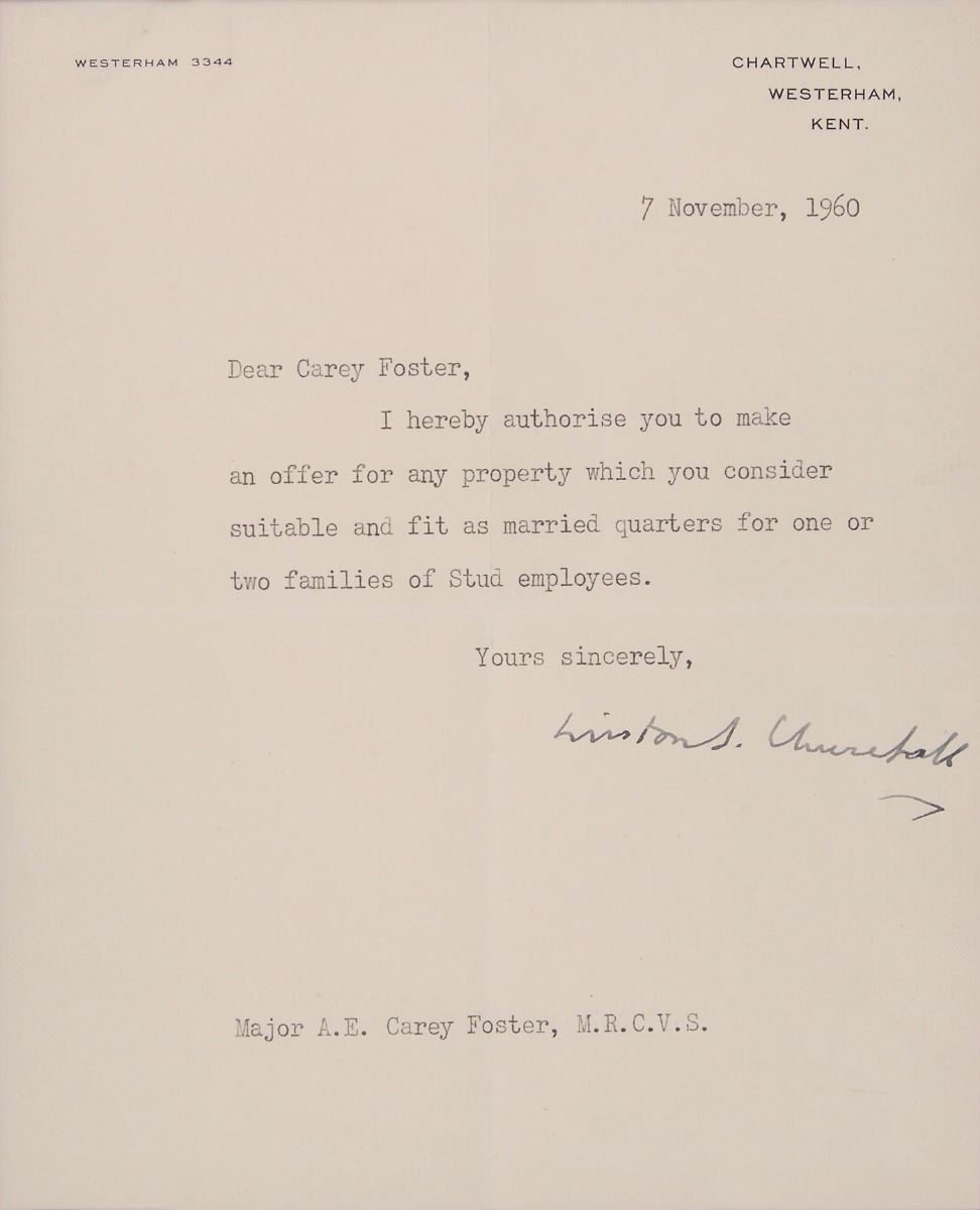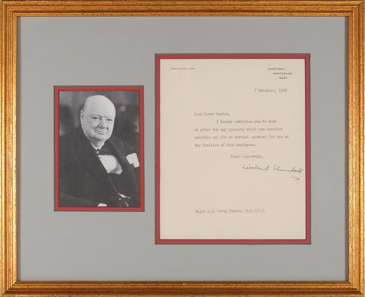 TLS signed “Winston S. Churchill,” one page, 7.25 x 9, Chartwell letterhead, November 7, 1960. Letter to Major A. E. Carey Foster, a veterinarian and breeder of thoroughbred horses. In full: “I hereby authorise you to make an offer for any property which you consider suitable and fit as married quarters for one or two families of Stud employees.” Nicely double-matted and framed with an image of Churchill to an overall size of 18 x 14.5. In fine condition, with central vertical and horizontal folds. Churchill was quite fond of horses, and after World War I he intervened to secure the safe return of tens of thousands of war horses stranded in Europe.