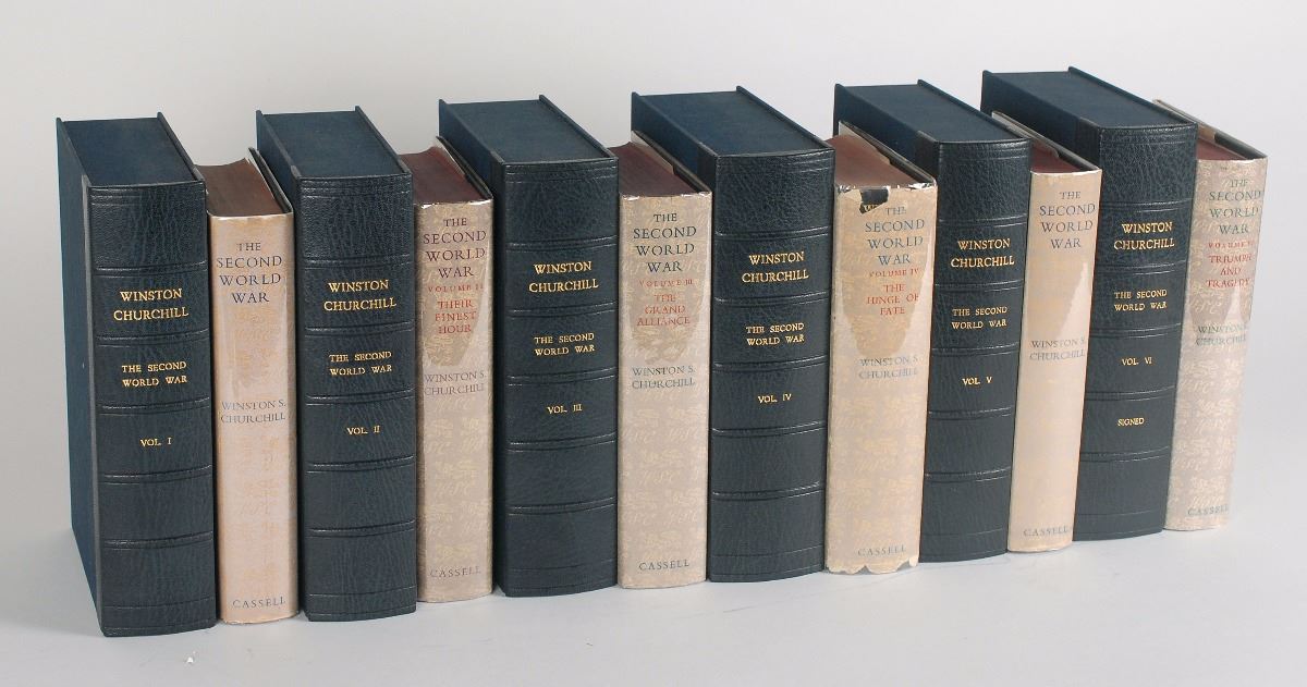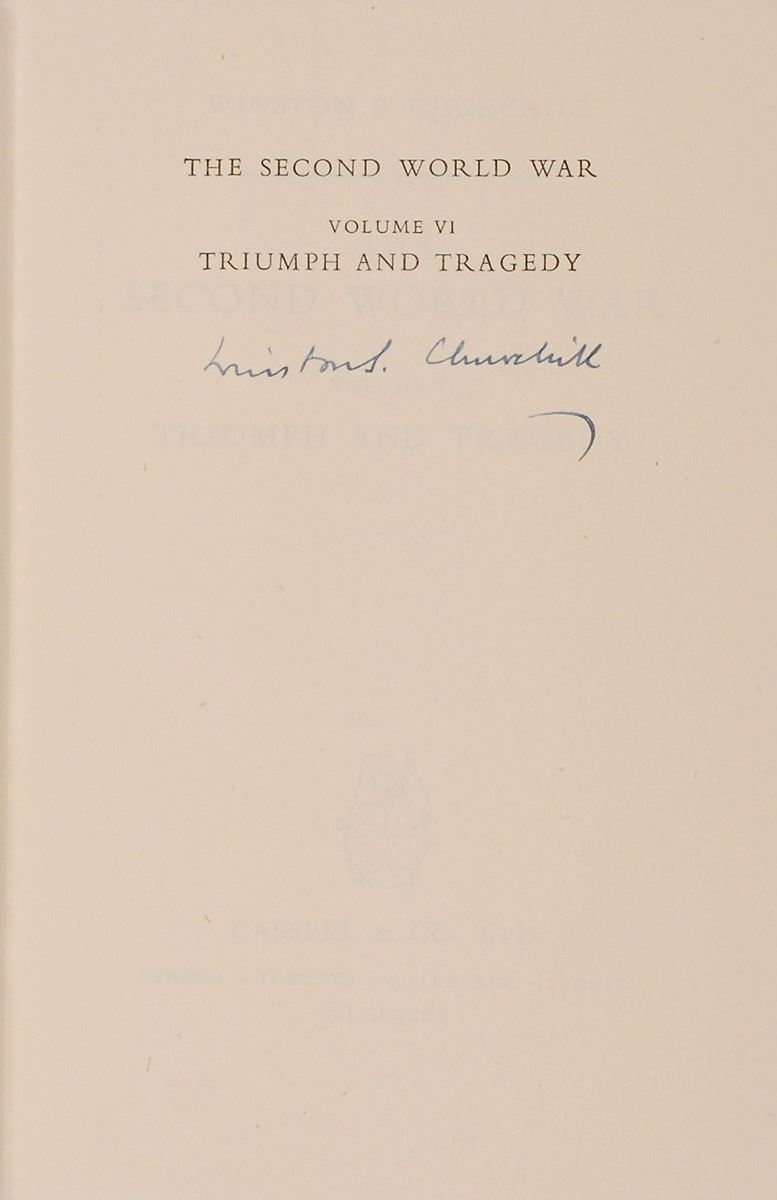 Complete book set: The Second World War, Volumes 1–6. First British editions. London: Cassell and Co. Ltd., 1948–1954. Hardcovers with dust jackets, 6 x 8.5. Beautifully signed on the half-title page of the sixth volume in fountain pen, “Winston S. Churchill.” Each volume is housed in a custom gilt-stamped clamshell box. Autographic condition: fine. Book condition: signed volume VG-/VG+; unsigned volumes overall VG/VG. As Britain’s prime minister for most of the Second World War, Winston Churchill had an unparalleled perspective on the conflict. After leaving office in 1945, he produced this remarkable account, which holds a very high place in the ranks of nonfiction books of the 20th century. The comprehensive series was a major success in both Great Britain and the United States, and was largely responsible for his being awarded the Nobel Prize for Literature in 1953.