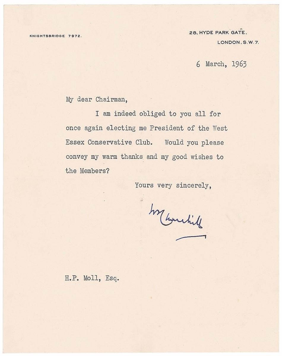 TLS signed “W. S. Churchill,” one page, 7.5 x 9.5, personal letterhead, March 6, 1963. Letter to H. P. Moll, in full: “I am indeed obliged to you all for once again electing me President of the West Essex Conservative Club. Would you please convey my warm thanks and my good wishes to the Members?" In fine condition. Consignor notes letter is from the estate of Major Jack Churchill, Sir Winston's brother.