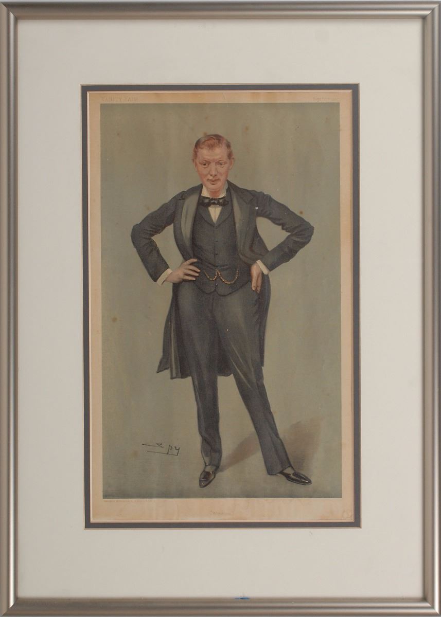 Color 9 x 14.75 chromolithograph print by the caricaturist ‘Spy’ from Vanity Fair, September 27, 1900, showing a young Winston Churchill with his arms akimbo. Double-matted and framed to an overall size of 15 x 21. In very good condition, with scattered foxing and dampstaining.