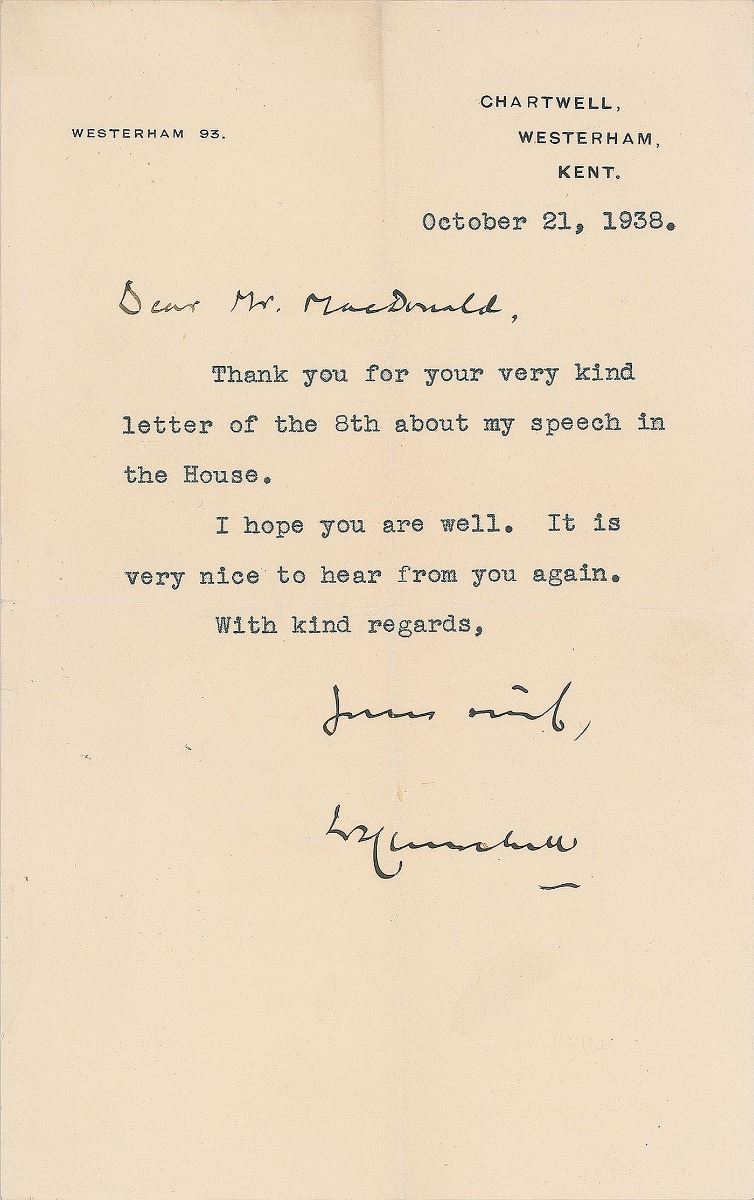 TLS signed “W. S. Churchill,” one page, 5 x 8, Chartwell letterhead, October 21, 1938. Letter to Mr. MacDonald. In full: “Thank you for your very kind letter of the 8th about my speech in the House. I hope you are well. It is very nice to hear from you again.” In fine condition, with intersecting folds. This undoubtedly references his address before the House of Commons on October 5, 1938, concerning the Munich Agreement and British policy toward Germany. Although Prime Minister Neville Chamberlain had infamously proclaimed that the agreement represented ‘peace for our time’ on September 30, Churchill was a staunch opponent of appeasement and declared it a ‘disaster of the first magnitude.’ Churchill’s evaluation of German intentions proved correct, as an emboldened Hitler would invade Poland the following year and spark world war.