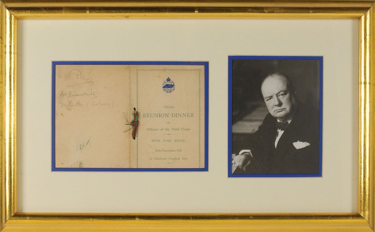 Menu for the Third Reunion Dinner of the Officers of the Tank Corps, held at the Hyde Park Hotel on November 19, 1921, 4 x 5.5, signed on the back cover in pencil by Winston Churchill, “W. Churchill,” General Sir Hugh Elles, “Hugh Elles,” and one other, “F. W. Butler (The Baron).” The menu retains its original decorative green and red ribbon on the left side of the cover. Attractively double-matted and framed unfolded with a portrait of Churchill to an overall size of 20.75 x 12.75, with a window on the reverse for viewing the menu inside. In very good condition, with moderate scattered soiling, brushing to graphite, and ink marks. This dinner was held to remember the British success at the Battle of Cambrai during World War I, in which Elles led 350 tanks into battle to great success in overcoming the seemingly impenetrable German trench defenses. Church bells rang throughout England in celebration, and each year the anniversary of the battle was commemorated as ‘Cambrai Day.’ As First Lord of the Admiralty, Churchill played an instrumental role in pushing the idea of armored tanks through the bureaucracy and onto the front lines. A terrific association between Churchill’s experience in World War I, and in his position as prime minister in the Second World War.