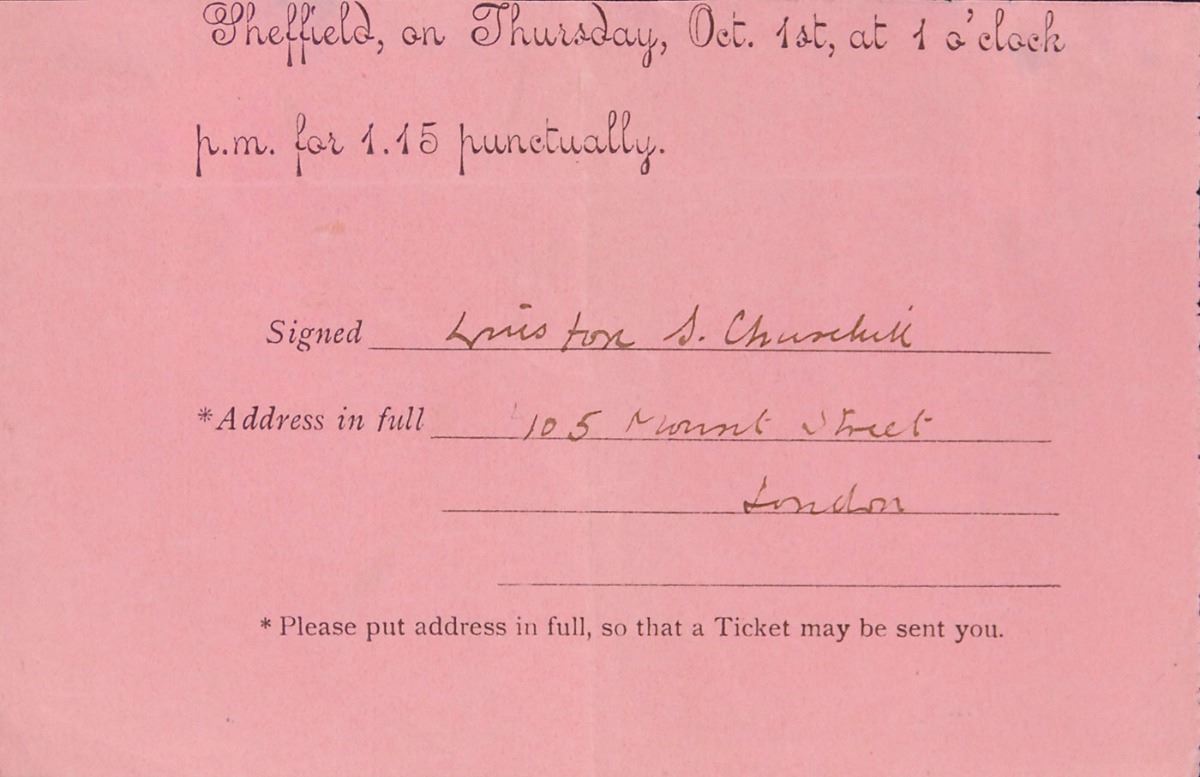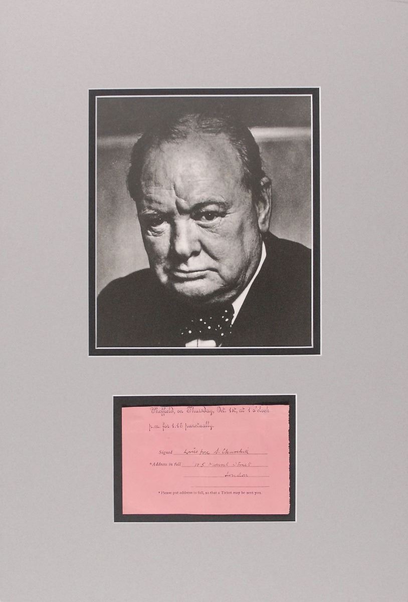 Partial DS, one page, 5 x 3.25, no date but circa September 1903. The concluding portion of a form for an event at “Sheffield, on Thursday, Oct. 1st, at 1 o’clock,” filled out and signed by Churchill to request that a ticket be sent to him, “Winston S. Churchill, 105 Mount Street, London.” Double-matted with a portrait of Churchill to an overall size of 12.75 x 18.5. In fine condition, with intersecting folds. Though undated, this is almost certainly for an event on October 1, 1903, as Churchill only lived at this Mount Street address from 1900 to 1905, and 1903 was the only year during this period that October 1 fell on a Thursday; this date also coincides with the Conservative National Union Conference at Sheffield, which Churchill attended.