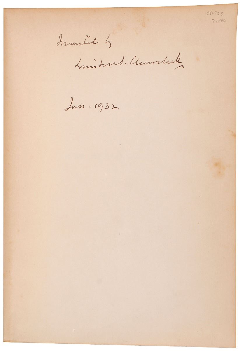 Signed book: The World Crisis. First abridged edition. NY: Charles Scribner's Sons, 1931. Hardcover, 7 x 9.5, 866 pages. Signed on the first free end page, “Inscribed by Winston S. Churchill, Jan. 1932.” Autographic condition: foxing and toning to first free end page, otherwise fine. Book condition: VG-/None.