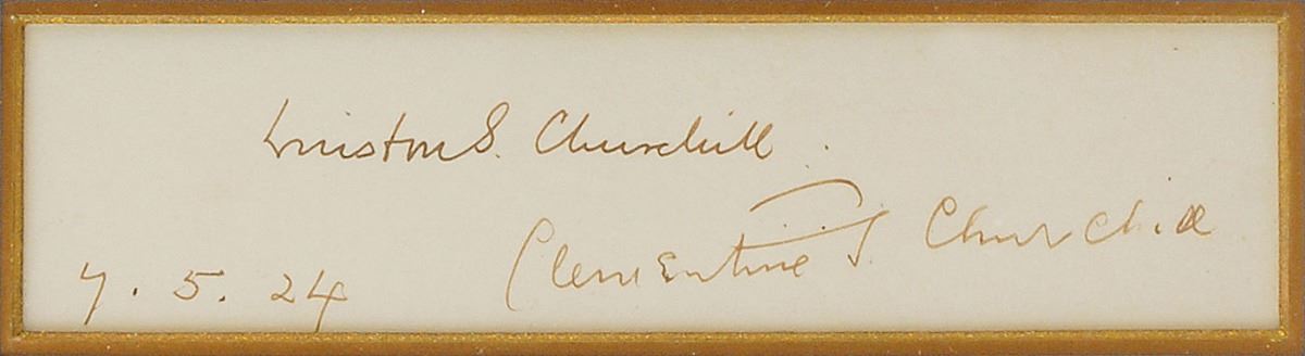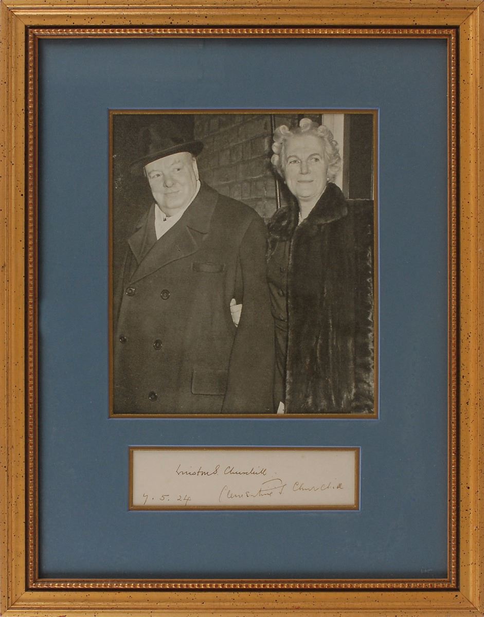 Ink signatures, “Winston S. Churchill” and “Clementine S. Churchill,” the latter adding the date, “7.5.24,” on an off-white 6.25 x 1.5 slip. Matted and framed with an image of the couple to an overall size of 13.25 x 16.75. In fine condition.