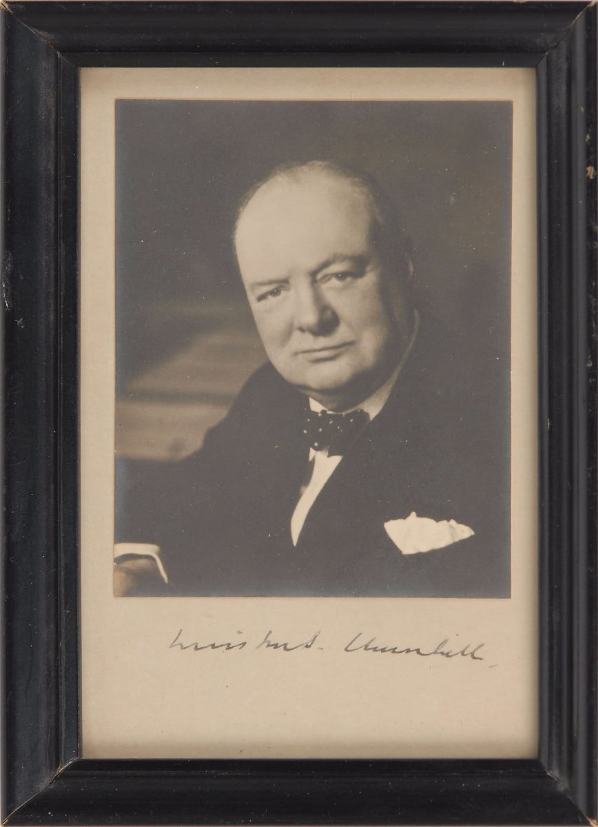 Classic matte-finish 3 x 4 portrait of Churchill affixed to a 4 x 6 mount, neatly signed on the mount in fountain pen, “Winston S. Churchill.” Framed and in fine condition.