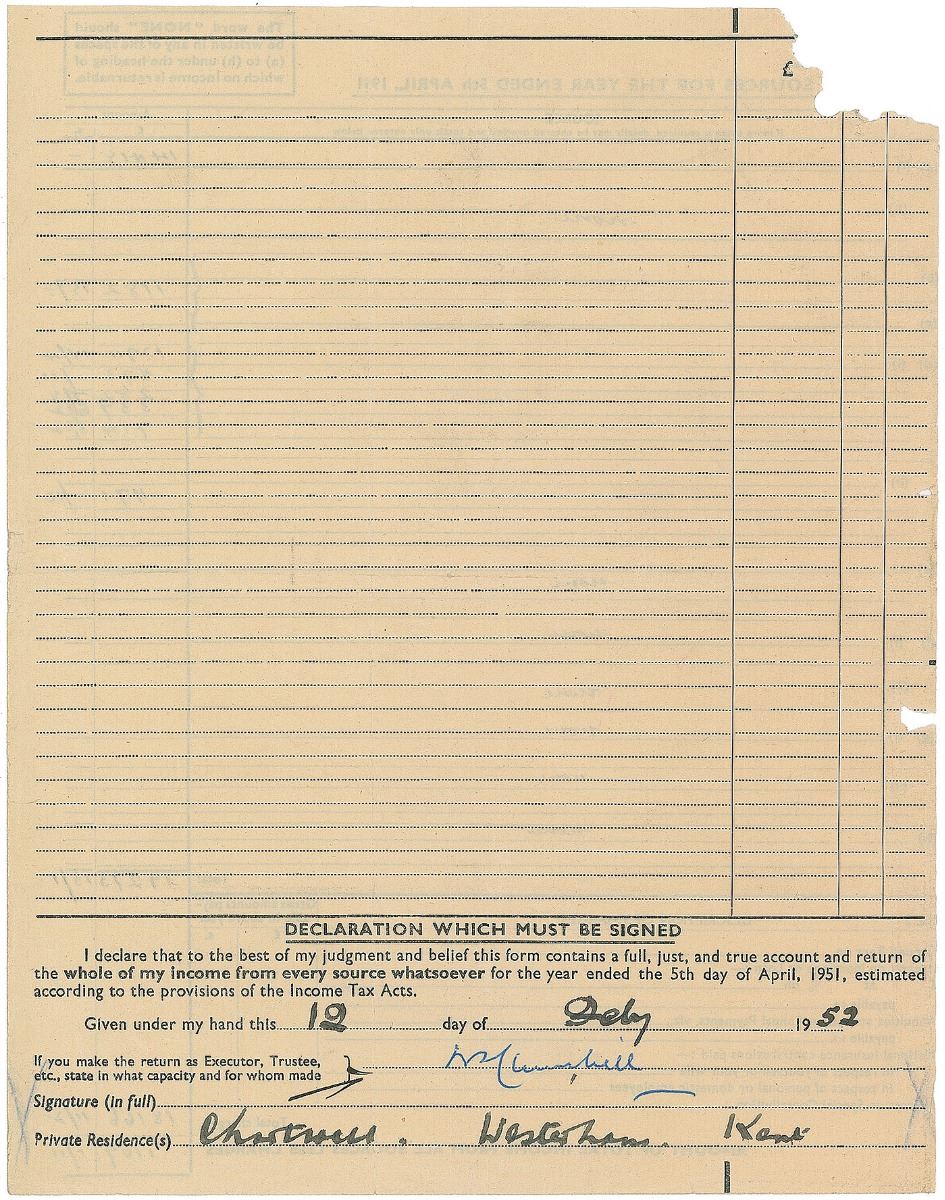 DS, signed “W. S. Churchill,” one page both sides, 7.25 x 9.55, February 12, 1952. A page from Churchill’s tax return for the tax year ending on April 5, 1949, listing his total income as “£19,273, 13/1,” with charges of “18,166, 11/2,” resulting in a taxable balance of “£1,107, 1/11.” Signed on the reverse in blue ballpoint by Churchill. In fine condition, with trimmed left edge affecting portions of the printed text, and paper loss to upper corner and one edge.