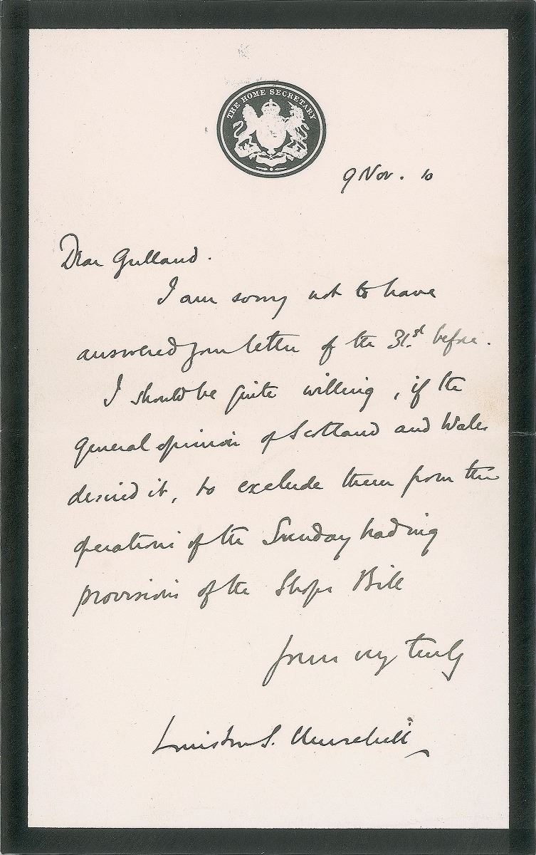 ALS signed “Winston S. Churchill,” one black-bordered page, 5 x 8, The Home Secretary letterhead, November 9, 1910. Letter to John William Gulland, in full: “I am sorry not to have answered your letter of the 31st before. I should be quite willing, if the general opinion of Scotland and Wales desired it, to exclude them from the operations of the Sunday trading provisions of the Shops Bill.” In fine condition.