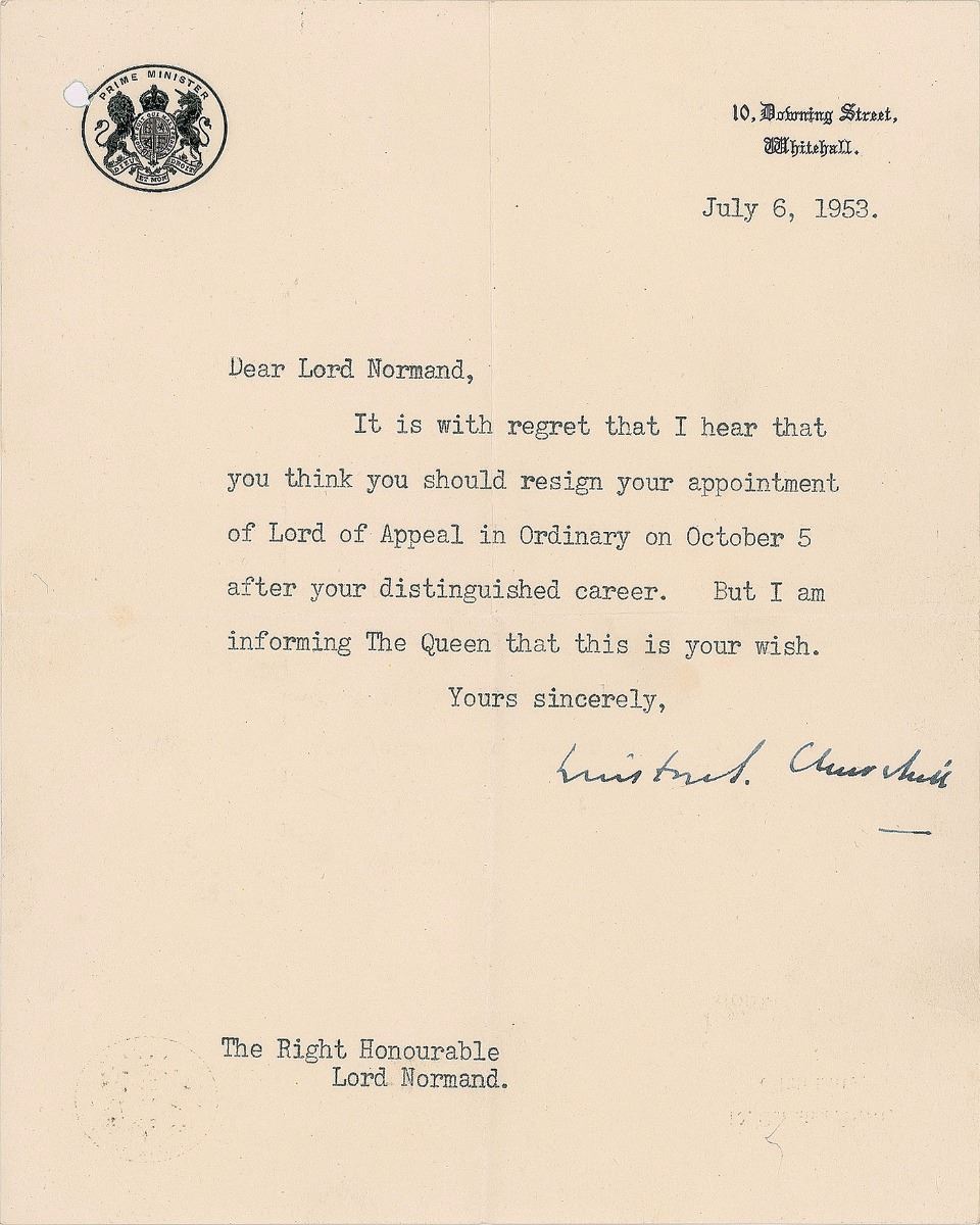 TLS signed “Winston S. Churchill,” one page, 7 x 8.75, Prime Minister letterhead, July 6, 1953. Letter to Lord Normand, in full: "It is with regret that I hear that you think you should resign your appointment of Lord of Appeal in Ordinary on October 5 after your distinguished career. But I am informing the Queen that this is your wish." In fine condition, with a singly filing hole to the upper left. In 1953, Churchill was invested as a Knight of the Garter and was awarded the Nobel Prize in Literature for his numerous published works, especially his six-volume set The Second World War.