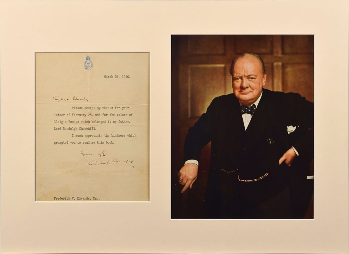 TLS signed “Yours v[ery] t[ruly], Winston S. Churchill,” one page, 6.5 x 8.25, Admiralty Whitehall letterhead, March 16, 1940. Letter to Frederick W. Edwards, in full: "Please accept my thanks for your letter of February 28, and for the volume of Gleig's Essays which belonged to my father, Lord Randolph Churchill. I mush appreciate the kindness which prompted you to send me his book." Churchill writes the salutation in his own hand. Matted with a portrait of Churchill to an overall size of 19.5 x 14. In fine condition, with intersecting folds and light soiling. Accompanied by a full letter of authenticity from JSA, as well as a letter of provenance from the son of the original recipient, in part: "His father Joseph Edwards knew Lord Randolph Churchill and he loaned this book to my grandfather. Then in 1940 my father returned the book to Winston, when he was Lord of the Admiralty." Also accompanied by the two photos of the original recipient as a young boy and as a a soldier in the Royal Flying Corps.