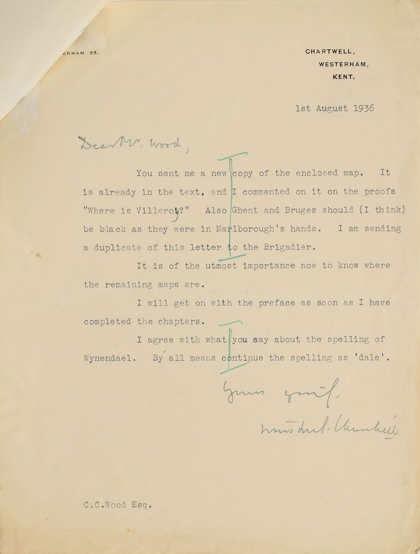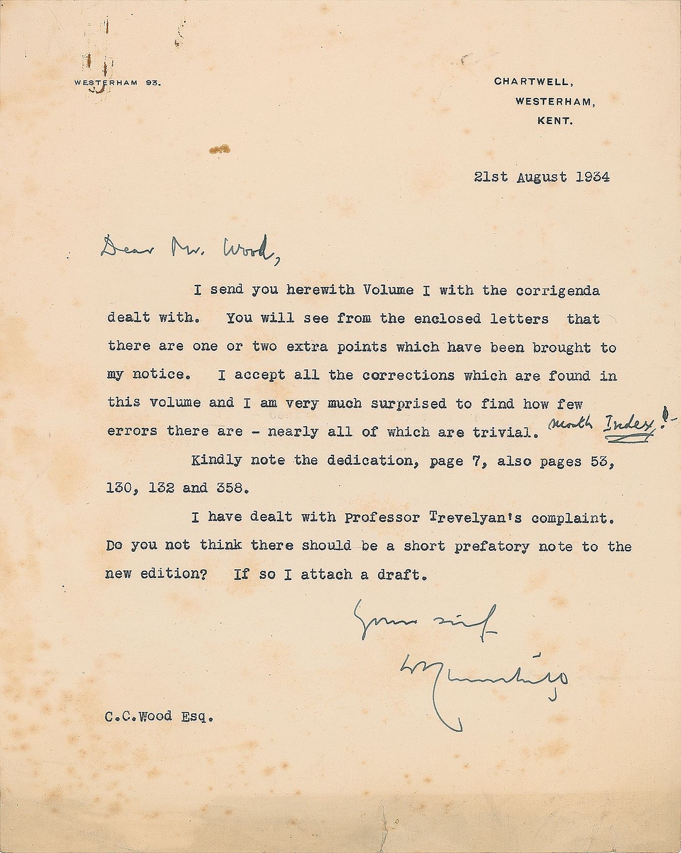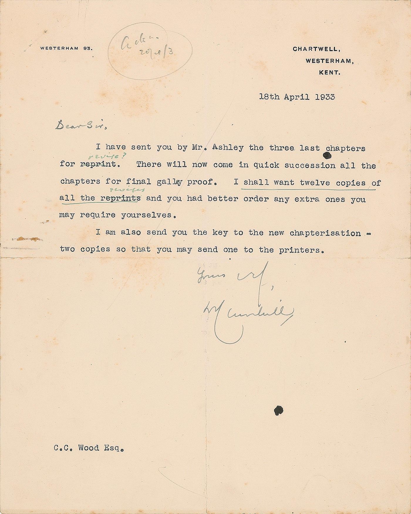 Amazing archive of 28 TLSs from Churchill to his proofreader and editor C. C. Wood relating to the publication of the monumental biography Marlborough: His Life and Times, dated from April 18, 1933, to October 29, 1938. Most letters addressed “Dear Mr. Wood” or “Dear Sir” in Churchill’s hand, and are signed by Churchill using one of several variations of his name, including “Winston S. Churchill,” “W. S. Churchill,” and “WSC.” Additionally includes: one galley proof page with handwritten corrections by Churchill, featuring 22 words in his hand; thirteen letters signed by various secretaries; one letter with signature excised; fourteen pages of proof corrections annotated in multiple hands (possibly some by Churchill); two proof maps; and fourteen telegrams from Churchill to Wood.