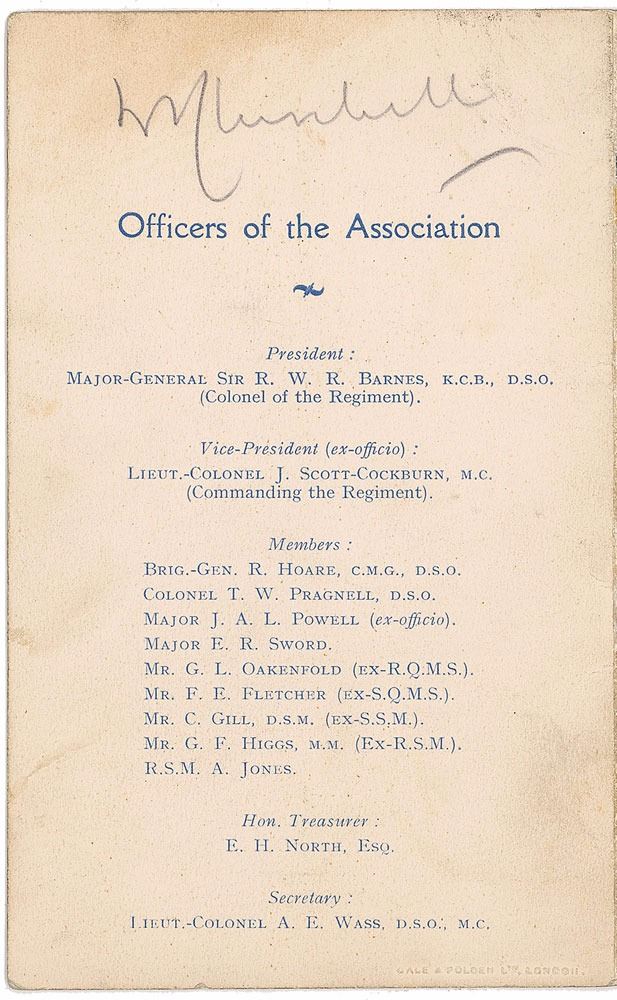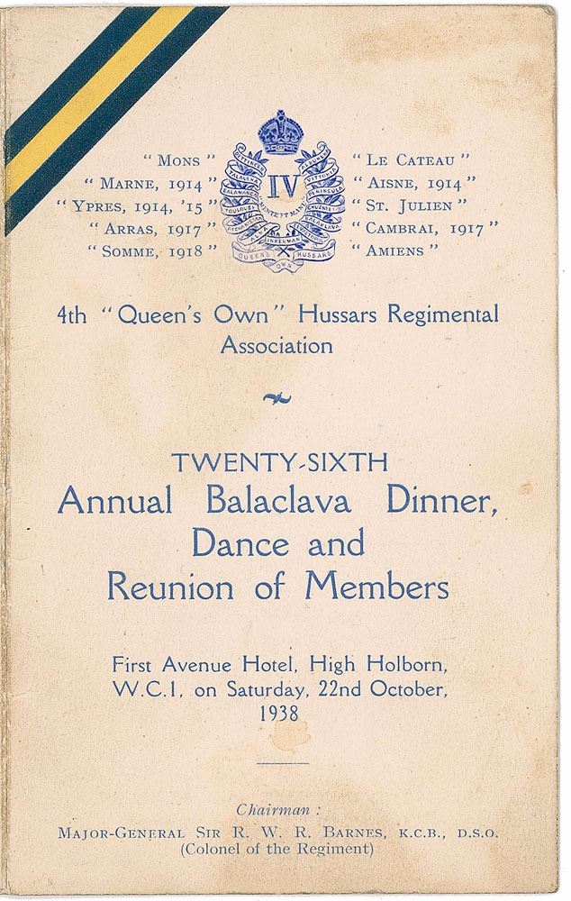 Menu for the twenty-sixth annual Balaclava Dinner, Dance and Reunion of Members of the 4th 'Queen’s Own' Hussars Regimental Association, four pages on two adjoining sheets, 3.75 x 6, held on October 22, 1938, signed on the back page in pencil, “W. Churchill.” In very good condition, with mild to moderate soiling and staining to the front and back covers, passing through the first few letters of Churchill’s name.