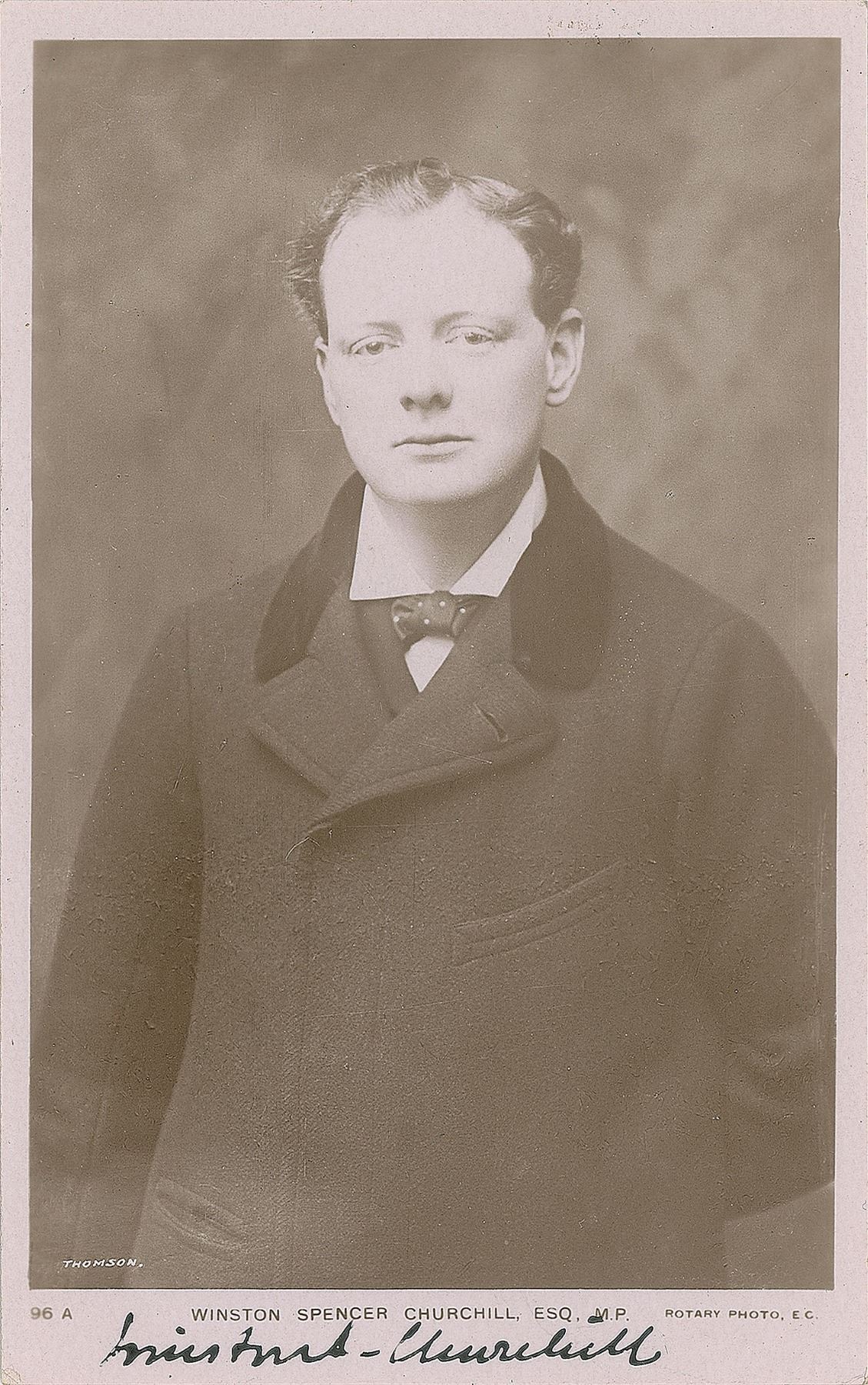 Wonderful glossy 3.5 x 5.5 Rotary Photo postcard of Churchill as a young man, boldly signed in the lower border in fountain pen, "Winston S. Churchill." Reverse bears a note written to Churchill, in part: "Dear Mr. Churchill, Will you very kindly sign this Post Card?" In fine condition, with a few light creases.