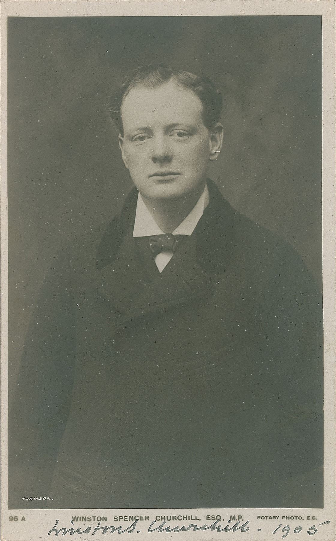 Vintage matte-finish 3.25 x 5.25 Rotary Photo postcard of Churchill from his early years in Parliament, neatly signed in the lower border in black ink, "Winston S. Churchill, 1905." In very fine condition.