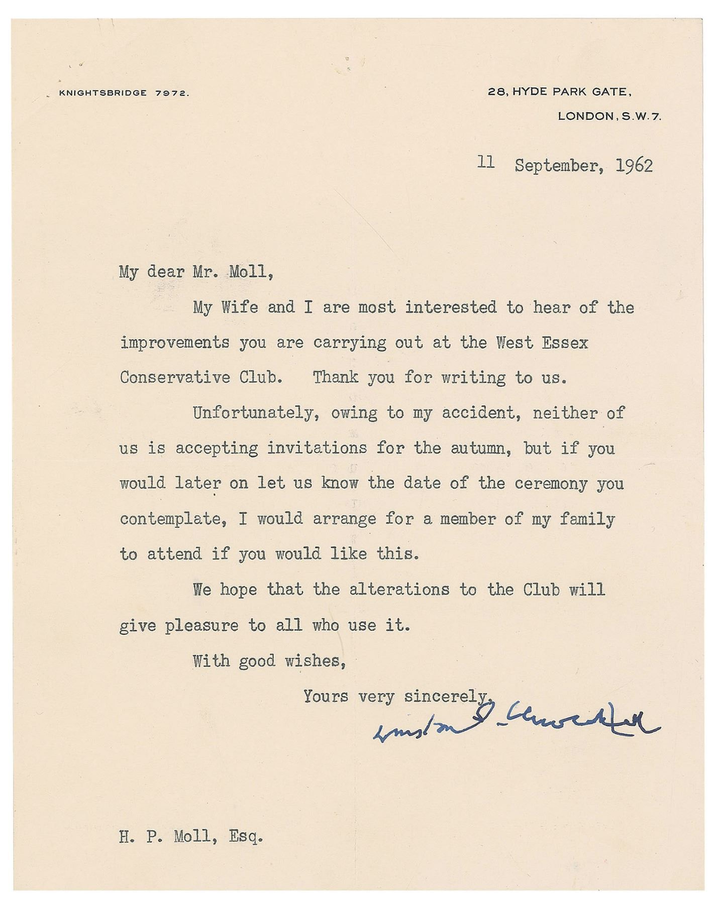 TLS signed "Winston S. Churchill," one page, 7.5 x 9.5, Hyde Park letterhead, September 11, 1962. Letter to H. P. Moll, in full: "My wife and I are most interested to hear of the improvements you are carrying out at the West Essex Conservative Club. Thank you for writing to us. Unfortunately, owing to my accident, neither of us is accepting invitations for the autumn, but if you would later on let us know the date of the ceremony you contemplate, I would arrange for a member of my family to attend if you would like this. We hope that the alterations to the Club will give pleasure to all who use it." In fine condition, with central horizontal and vertical fold and a couple staple holes to top edge. Churchill's accident—a broken leg suffered while vacationing in the French Riviera—began a slow but steady decline in his health and a gradual withdrawal from public life until his death on January 24, 1965.