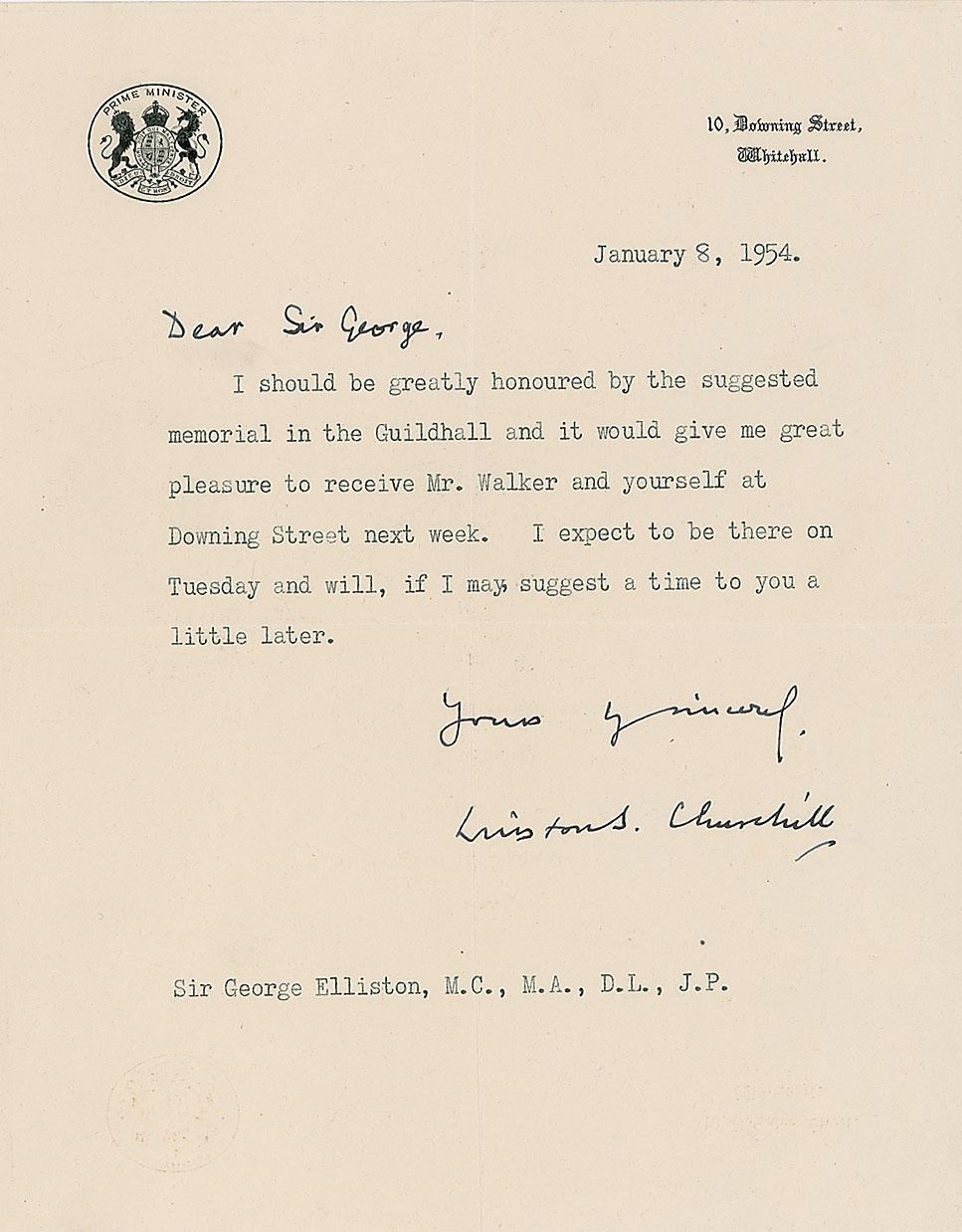 End portion of a cigar, measuring 2.25? in length, presented to Sir George Elliston by Prime Minister Winston Churchill during a meeting at 10 Downing Street in early January 1954. Included with the cigar is a TLS signed “Yours sincerely, Winston S. Churchill,” one page, 7.5 x 9.5, Prime Minister letterhead, January 8, 1954. The letter, which makes reference to the very meeting that Churchill would present to Elliston the offered cigar, reads in full: “I should be greatly honoured by the suggested memorial in the Guildhall and it would give me great pleasure to receive Mr. Walker and yourself at Downing Street next week. I expect to be there on Tuesday and will, if I may, suggest a time to you a little later.” Churchill adds the salutation in his own hand, “Dear Sir George.” In overall fine condition.
