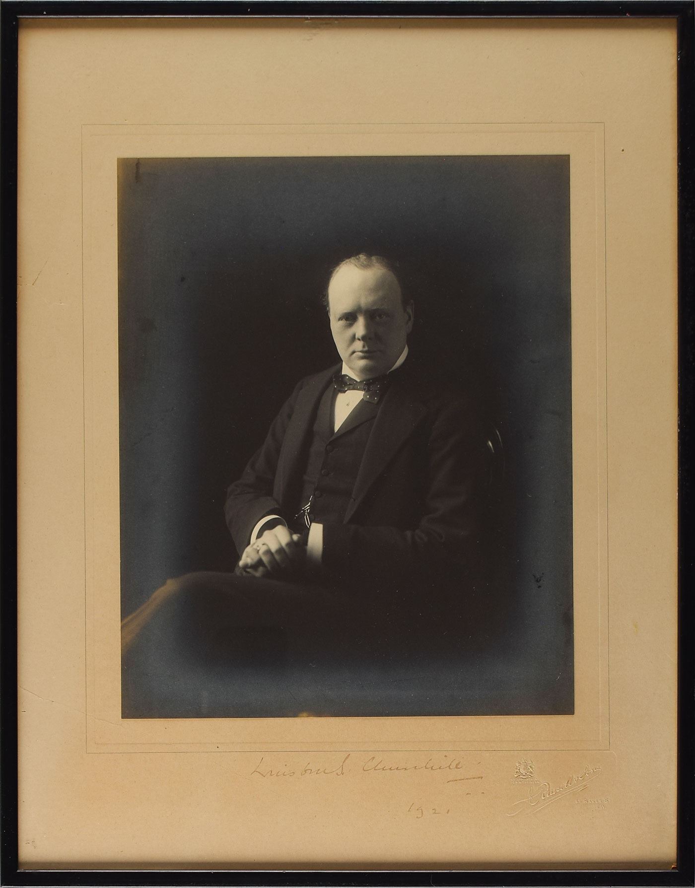Amazing vintage matte-finish 9 x 11 three-quarter-length portrait of the seated Churchill taken in 1920 by Edward Russell of Russell & Sons, affixed to its original 13 x 16.75 studio mount, signed on the mount in ink, "Winston S. Churchill, 1921." Framed and in very good to fine condition, with silvering to the perimeter of the image, creasing to the left border of the mount, and the signature a couple of shades light. In February 1921, Churchill was appointed by Prime Minister David Lloyd George as Secretary of State for the Colonies, during which time he was a signatory to the Anglo-Irish Treaty that established the Irish Free State.