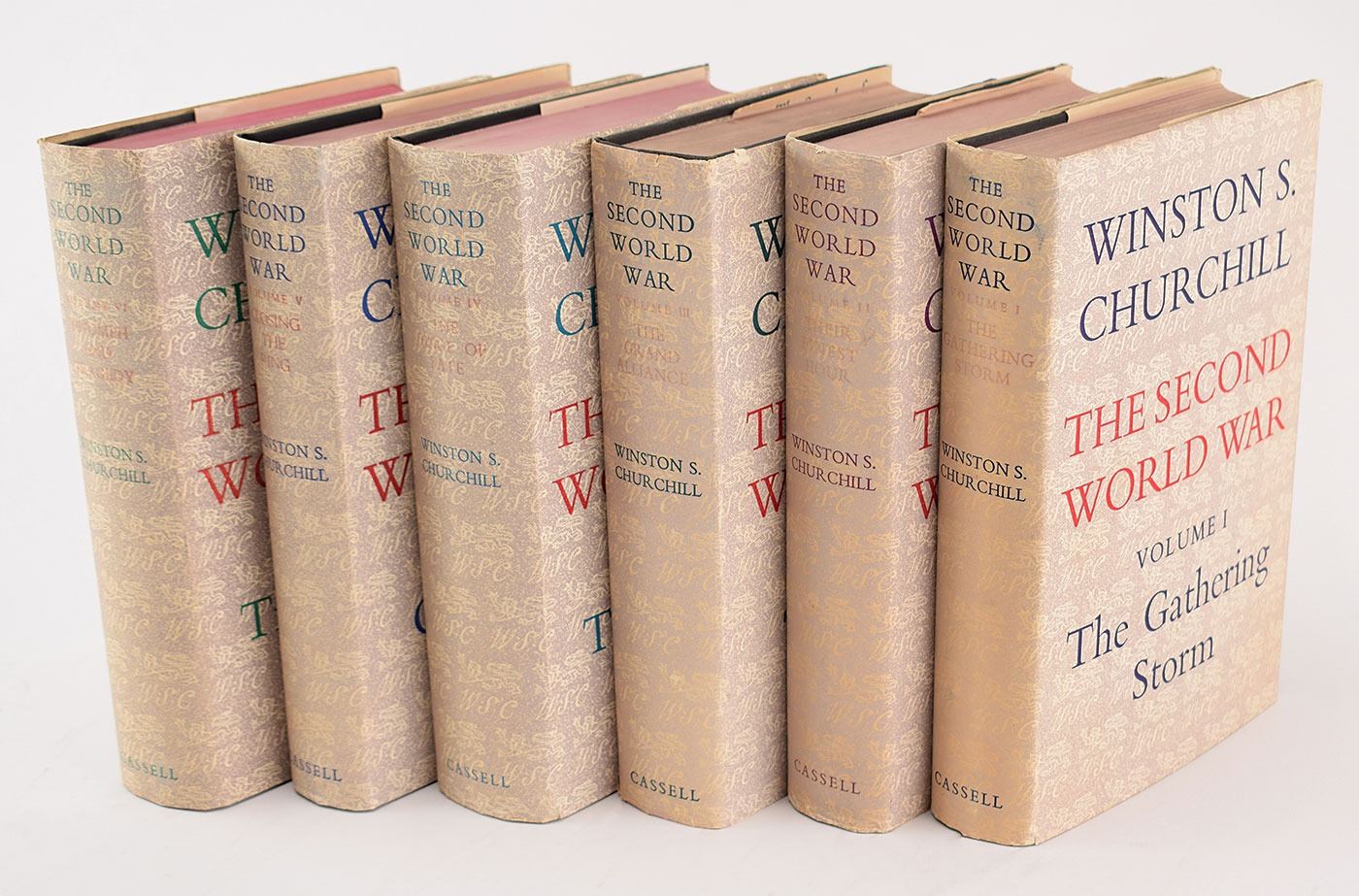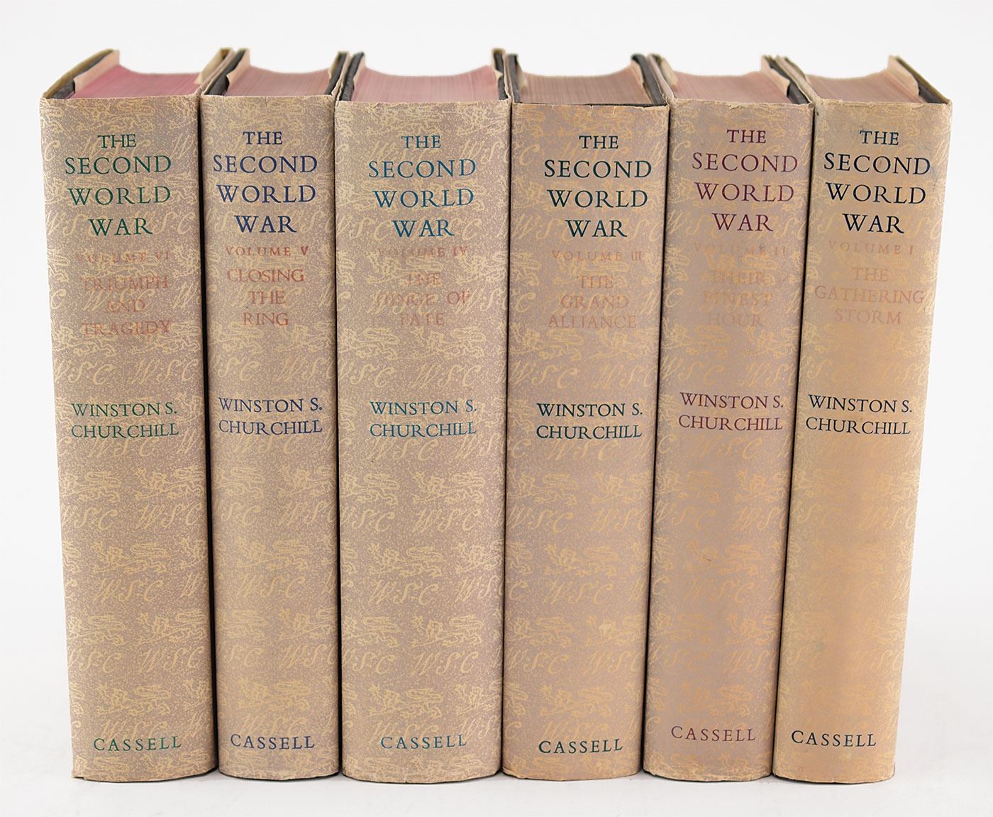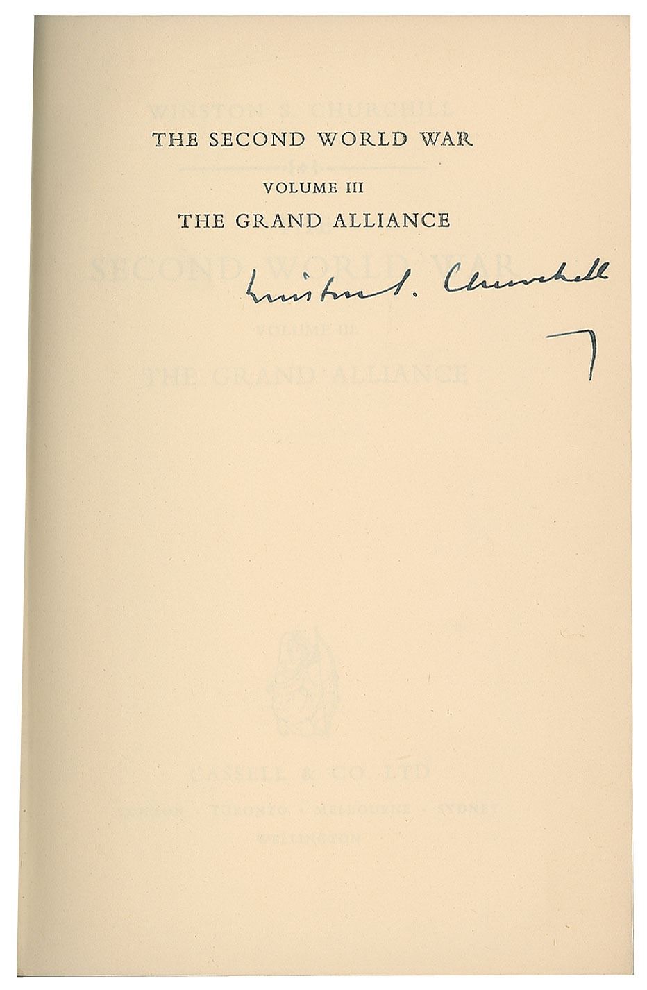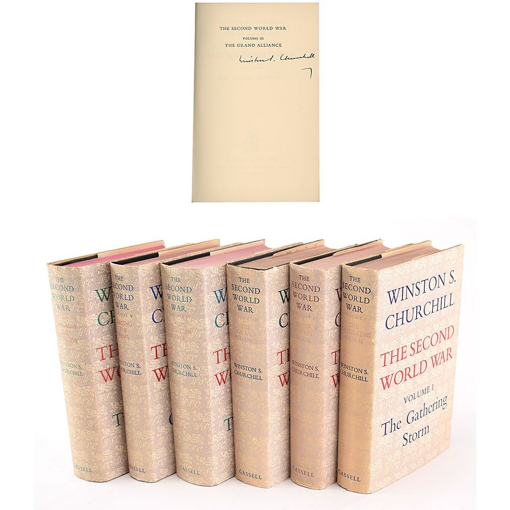 Complete book set: The Second World War, Volumes I–VI. First British editions. London: Cassell and Co. Ltd., 1948-1954. Hardcovers with dust jackets, 6 x 8.5. Beautifully signed on the half-title page of the third volume in fountain pen, "Winston S. Churchill." Autographic condition: fine. Overall book condition: VG+/VG+. As Britain's prime minister for most of the Second World War, Winston Churchill had an unparalleled perspective on the conflict. After leaving office in 1945, he produced this remarkable account, which holds a very high place in the ranks of nonfiction books of the 20th century. The comprehensive series was a major success in both Great Britain and the United States, and was largely responsible for his being awarded the 1953 Nobel Prize for Literature 'for his mastery of historical and biographical description as well as for brilliant oratory in defending exalted human values.'