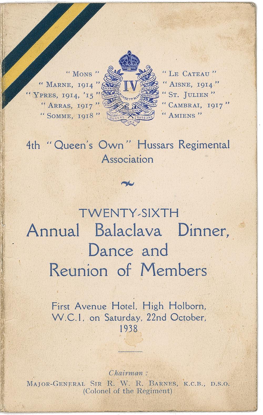 Original 3.75 x 6 menu from the twenty-sixth annual Balaclava Dinner, Dance and Reunion of Members of the 4th “Queen’s Own” Hussars Regimental Association, held on October 22, 1938, signed “W. Churchill” in pencil on the reverse. In very good condition, with mild to moderate soiling and staining to the front and back covers passing through the first few letters of Churchill’s name.