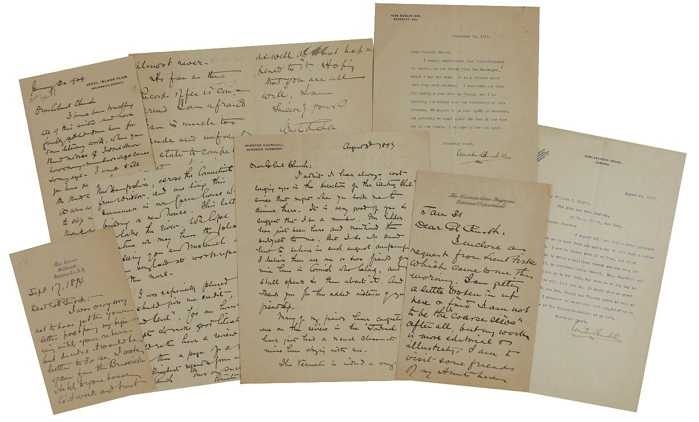Best-selling American novelist. Eight letters, consisting of six ALSs and two TLSs, ranging in date from 1894 to 1913, all written to Colonel William C. Church of the Army and Navy Journal. In very good overall condition. RRAuction COA.