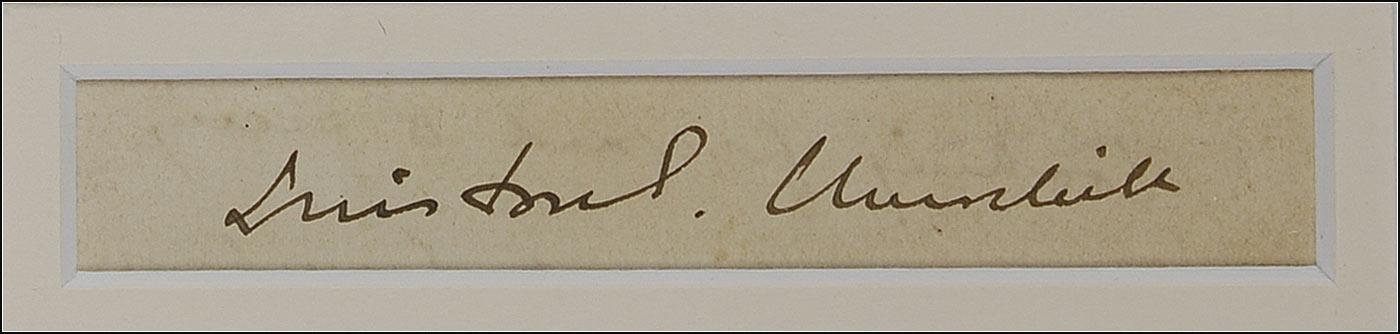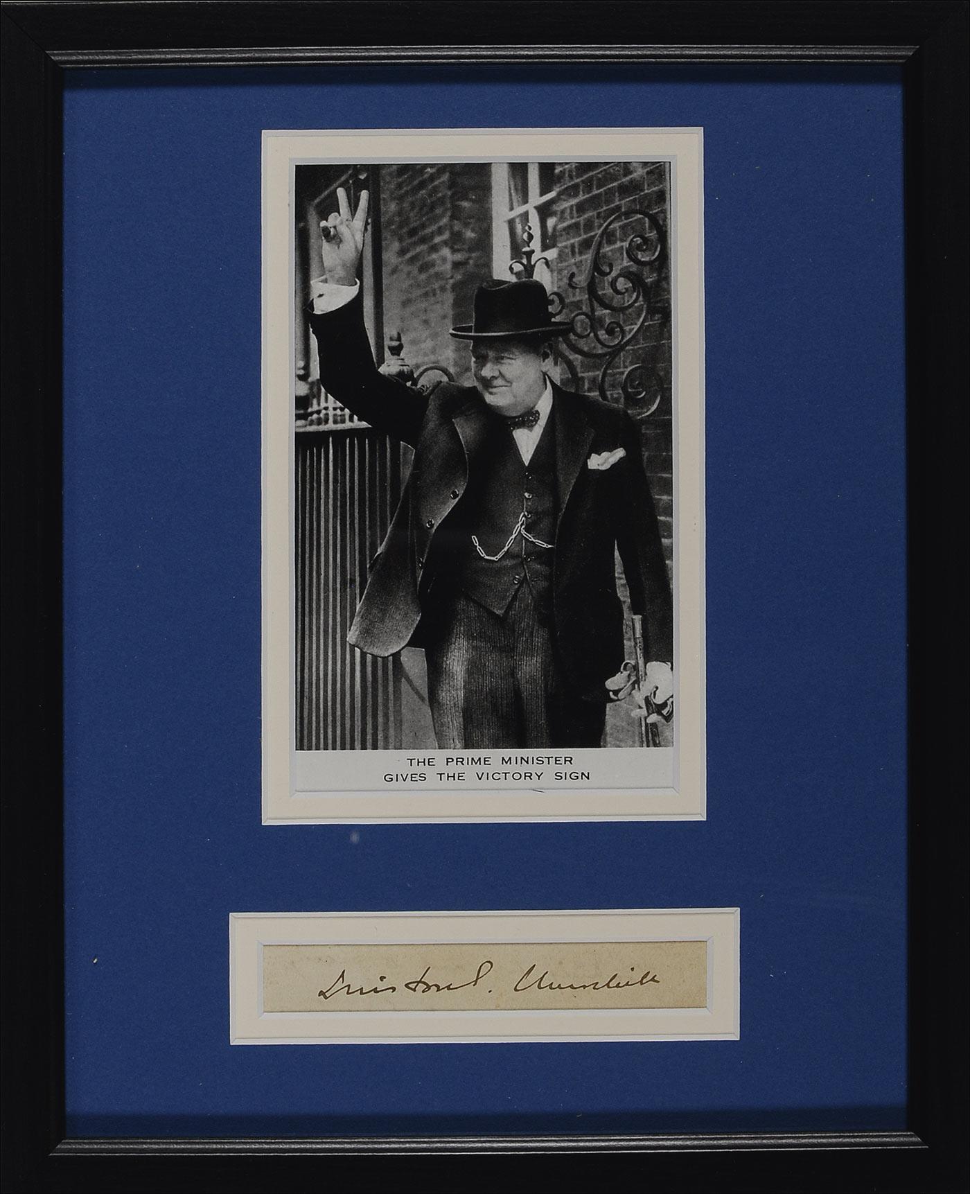 Vintage fountain pen signature, “Winston S. Churchill,” on an off-white 4 x 1 slip. In fine condition, with writing on reverse lightly showing through. Double matted and framed, with a photo of the prime minister giving the victory sign, to an overall size of 8.75 x 10.75.