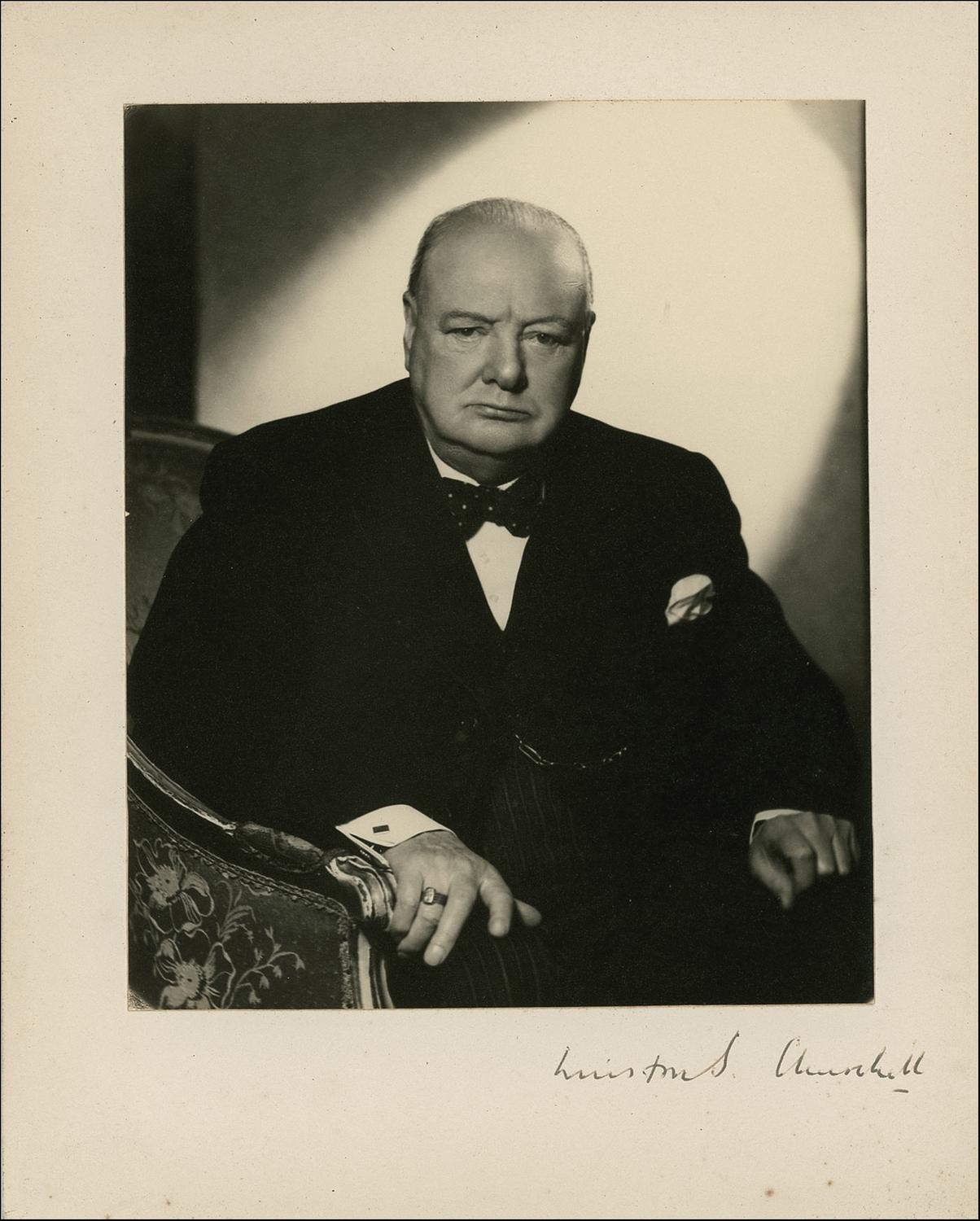 Vintage 6 x 7.5 Vivienne seated portrait of a confident and determined looking Churchill, affixed to its original 8 x 10 photographer’s mount, signed in fountain pen in the lower border of the mount, “Winston S. Churchill.” In fine condition, with a light surface crease to lower right corner and a few trivial spots of foxing to mount. An exceptional pose in which Churchill’s confidence and determination exudes.