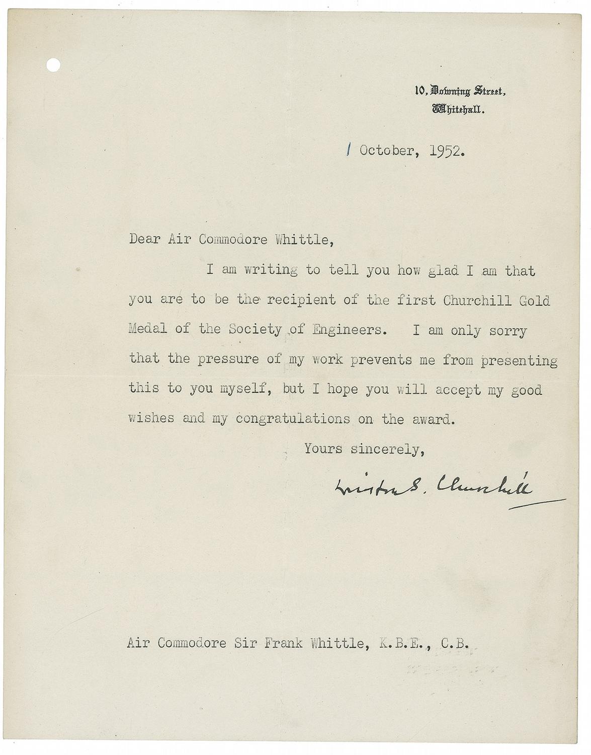 TLS signed “Winston S. Churchill,” one page, 7.5 x 9.5, 10 Downing Street letterhead, October 1, 1952. Letter of congratulations to Air Commodore Sir Frank Whittle. In full: “I am writing to tell you how glad I am that you are to be the recipient of the first Churchill Gold Medal of the Society of Engineers. I am only sorry that the pressure of my work prevents me from presenting this to you myself, but I hope you will accept my good wishes and my congratulations on the award.” Central horizontal and vertical fold, punch hole to top left, and a bit of mild toning, otherwise fine condition.