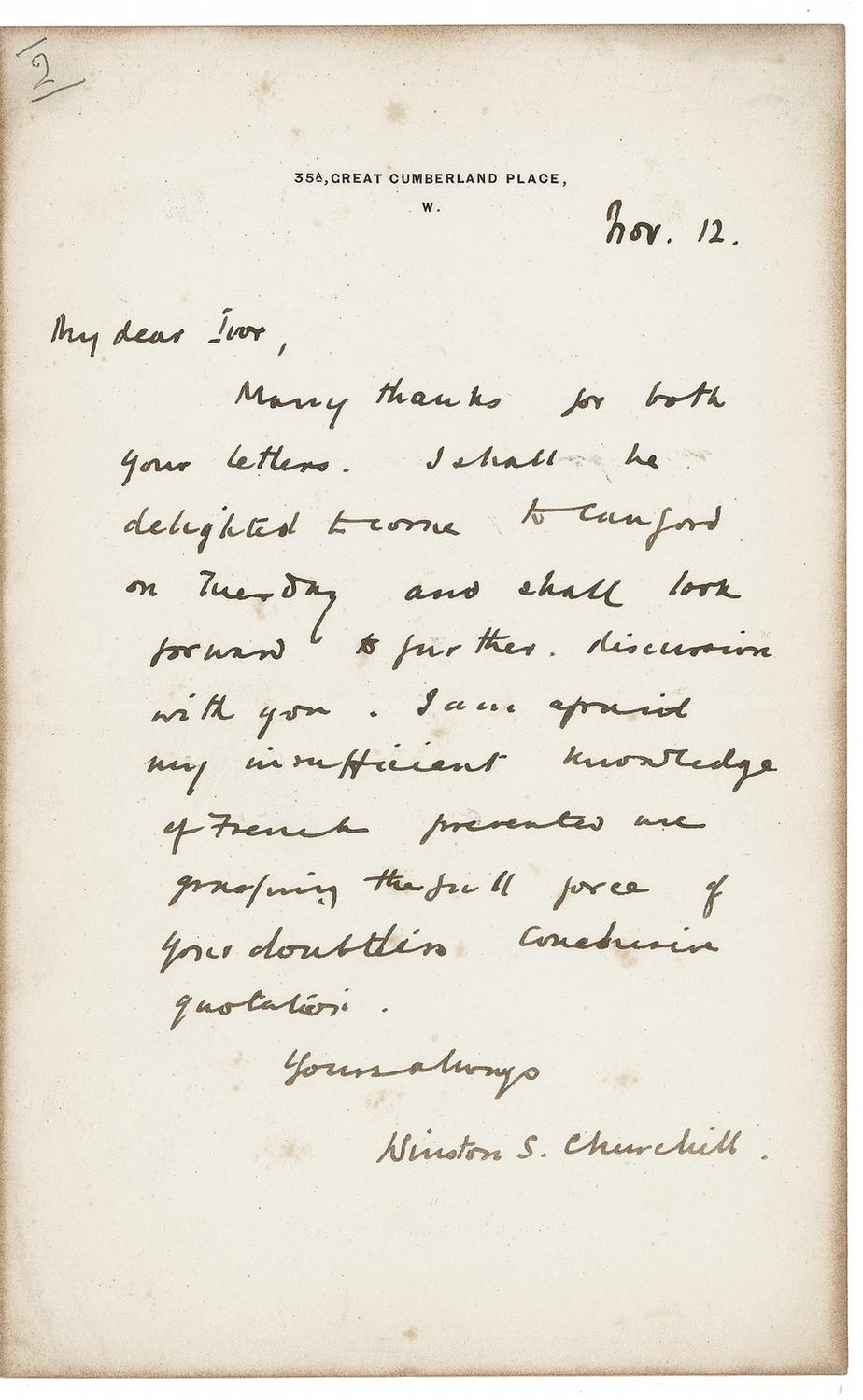 ALS signed “Winston S. Churchill,” one page, 5 x 8, personal letterhead, November 12. Letter to his cousin, Ivor Viscount Wimborne. In full: “Many thanks for both your letters. I shall be delighted to come to Canford on Tuesday and shall look forward to further discussions with you. I am afraid my insufficient knowledge of French prevents me grasping the full force of your doubtless conclusive quotation.” Mild toning and soiling, primarily to edges, and some scattered light foxing, otherwise fine condition.