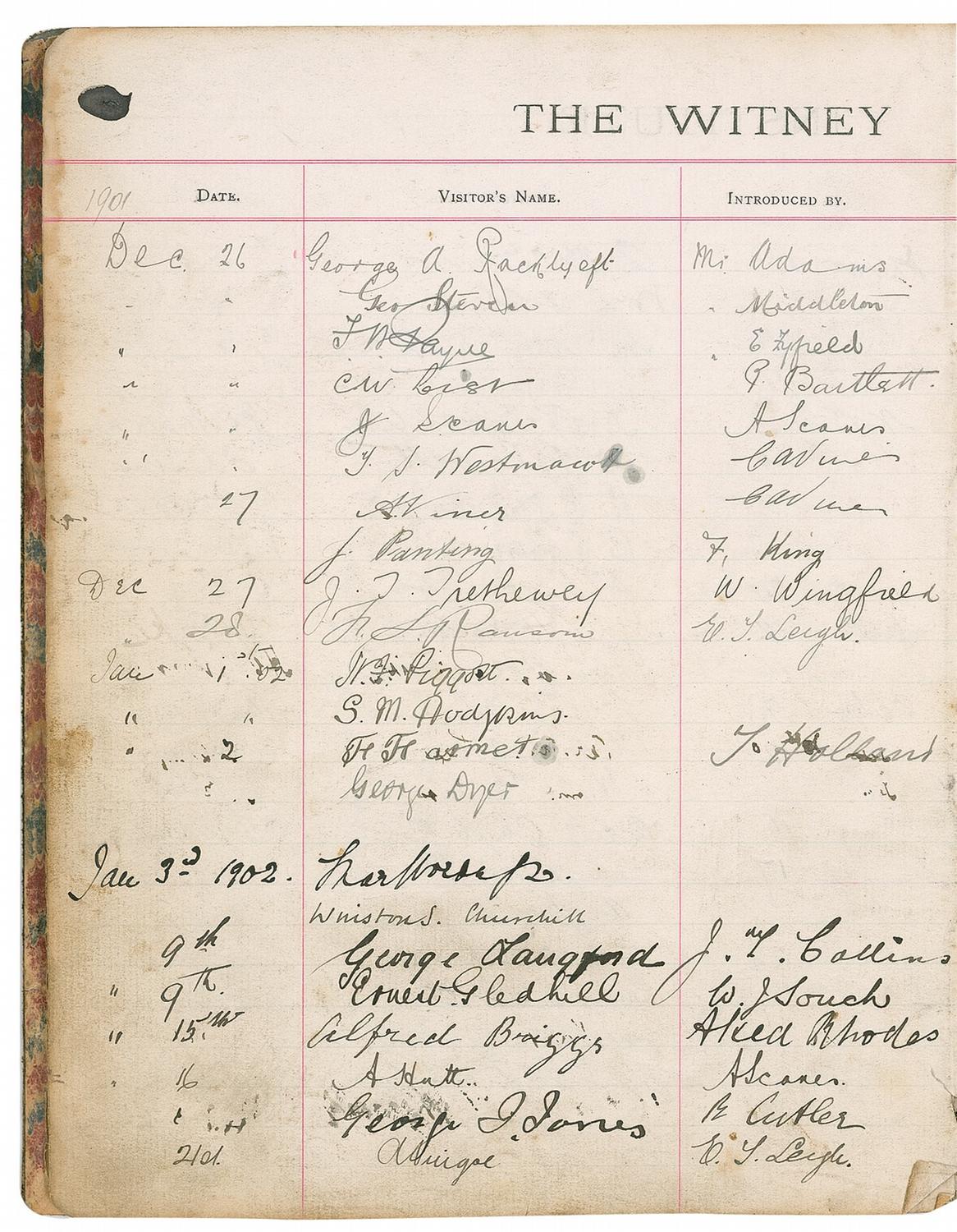 Visitors Register for the Whitney Institute, 7.75 x 9.75, 46 pages, containing approximately 1000 guest signatures from 1901-1920, most of which are accompanied by a member signature in the “Introduced By” column. Signed on the third page “Winston S. Churchill,” on January 3, 1902, also signed by Churchill’s cousin, the 9th Duke of Marlborough. In very good condition, with scattered toning and soiling, tear to lower right, and some stray ink marks. Register itself rates good to very good, with toning and soiling throughout, edge tears, some scattered paper loss, and moderate wear and surface loss to covers and spine. The next day, Churchill, who was at this particular social club to enroll recruits for the Boer War, was commissioned as a captain in the Queen’s Own Oxfordshire Hussars (QOOH), a regiment of the British Army between 1888 and 1922.