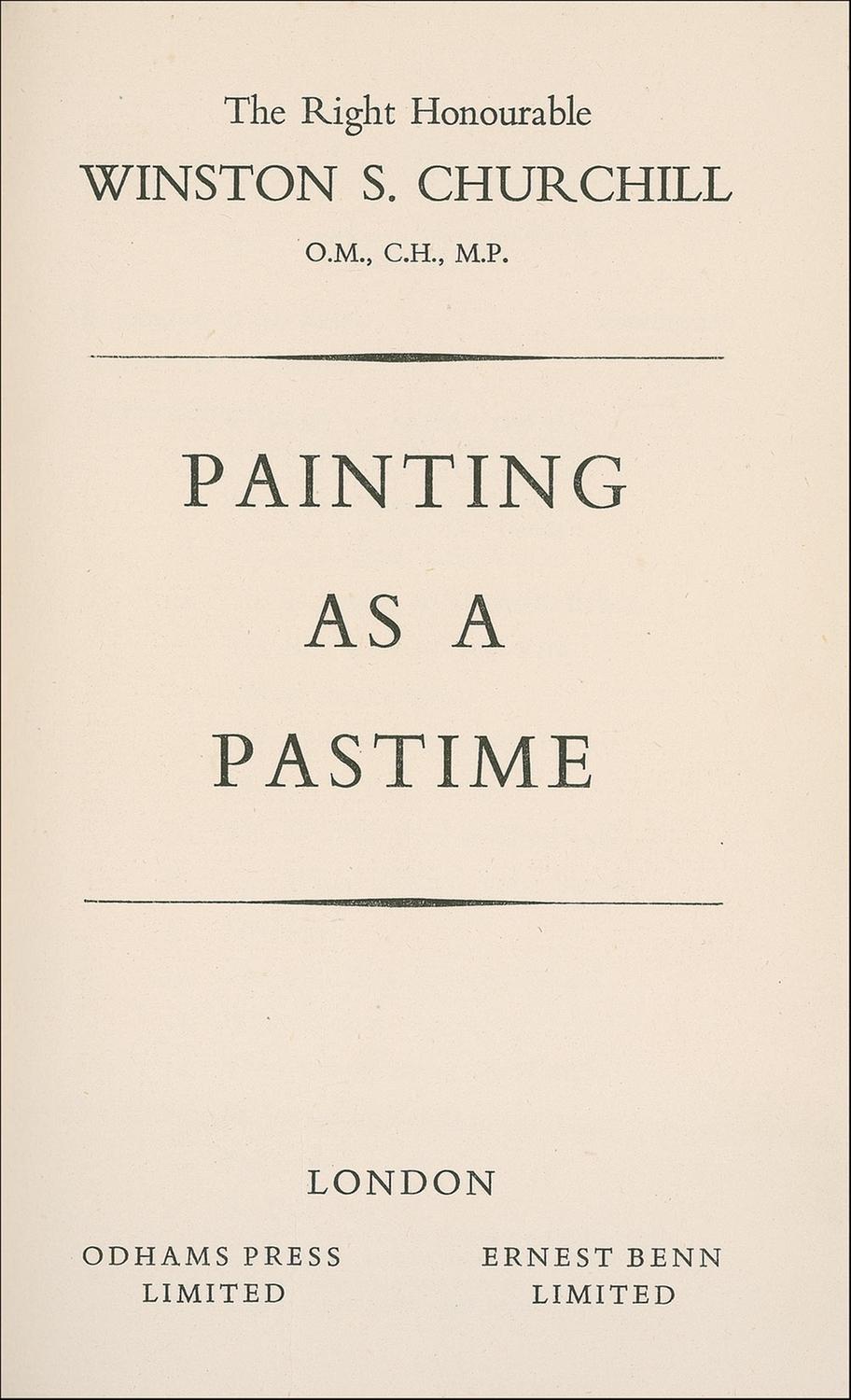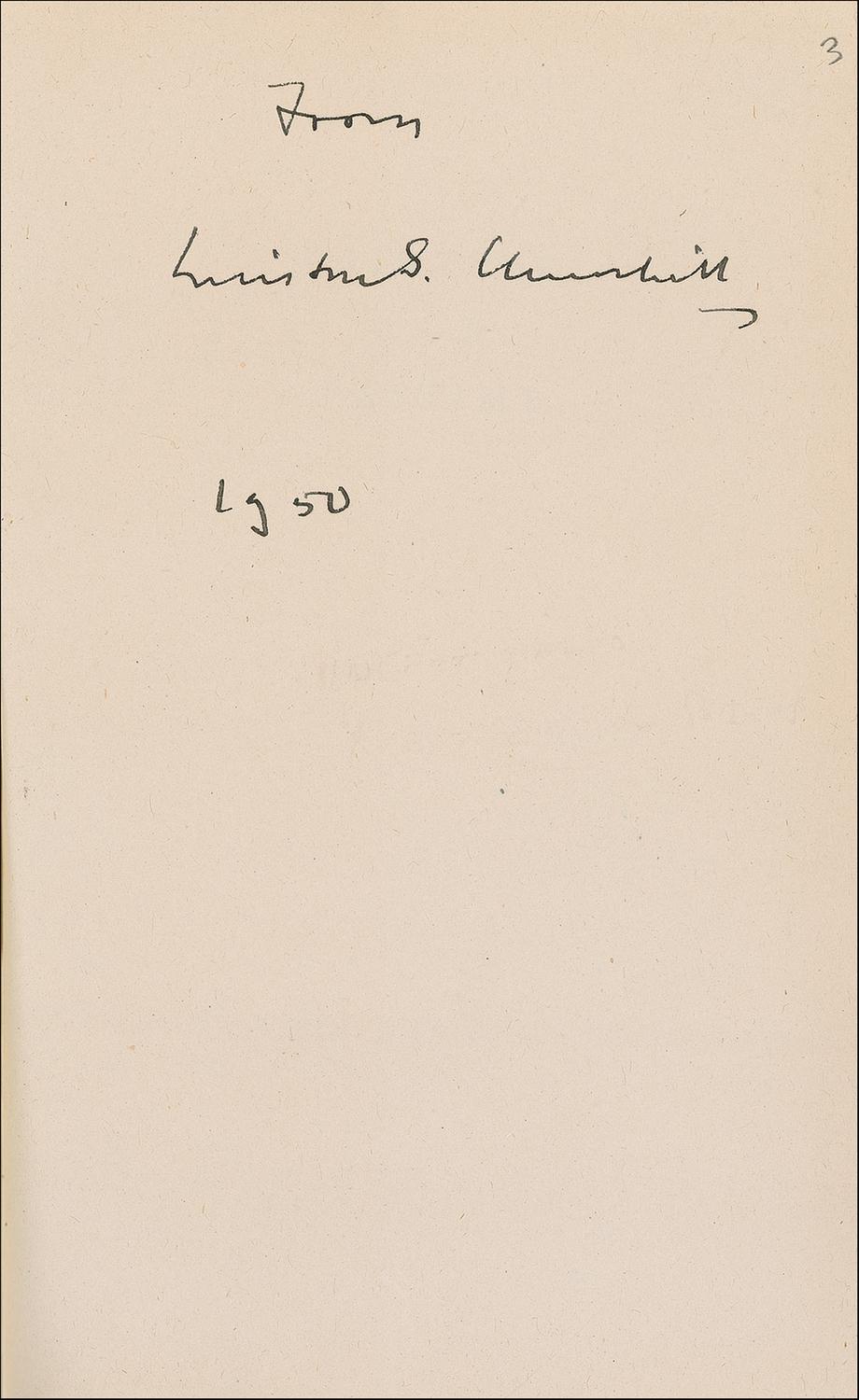 Signed book: Painting as a Pastime. First edition. London: Odhams Press Limited, 1948. Rebound leatherbound hardcover, 5.5 x 8.25, 32 pages plus 16 color pages of his art. Signed on the fourth free end page in fountain pen, “From Winston S. Churchill 1950.” In fine condition, with some mild rippling to fore-edges of pages and a bit of light wear to covers. A very informative look at in the life of Churchill and his view of life around him, seldom seen in signed copies.
