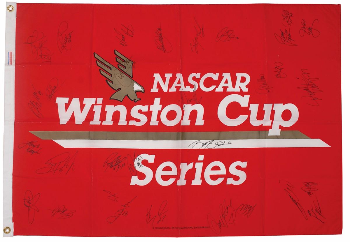 Bright red NASCAR Winston Cup Series flag, 40 x 27, signed in black felt tip by approximately thirty drivers, including: Kyle Petty, Ward Burton, Ken Schrader, Brett Bodine, Jimmy Spencer, Bill Elliott, Derrike Cope, Sterling Marlin, Dick Trickle, Bobby Labonte, Kenny Wallace, Ricky Rudd, Steve Grissom, Darrell Waltrip, and over fifteen others. In fine condition. Accompanied by a full letter of authenticity from JSA.