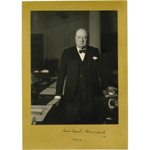 <B>Winston S. Churchill Photograph Signed</B></I> “<I>Winston S. Churchill/1943</B></I>” as British Prime Minister, 6” x 8” three-quarter length black and white photograph mounted on a 7.5” x 10.5” photo matte-board. Diagonal soiling in area across top of photograph and between Churchill's hands. Two dents on photo on Churchill's right lapel and in blank area to his left. On January 14, 1943, Winston Churchill and Franklin D. Roosevelt met at Casablanca and declared that they would accept nothing short of unconditional surrender from any Axis power. Churchill, F.D.R., and Soviet leader Joseph Stalin met in Teheran November 28 - December 1, 1943 and reaffirmed their joint policy of accepting nothing less than an unconditional surrender from Germany. Excellent signature. <BR><BR><b>Shipping:</b> Flat Material, Small (<a target="_blank" href="http://www.heritageauctions.com/common/shipping.php">view shipping information</a>)